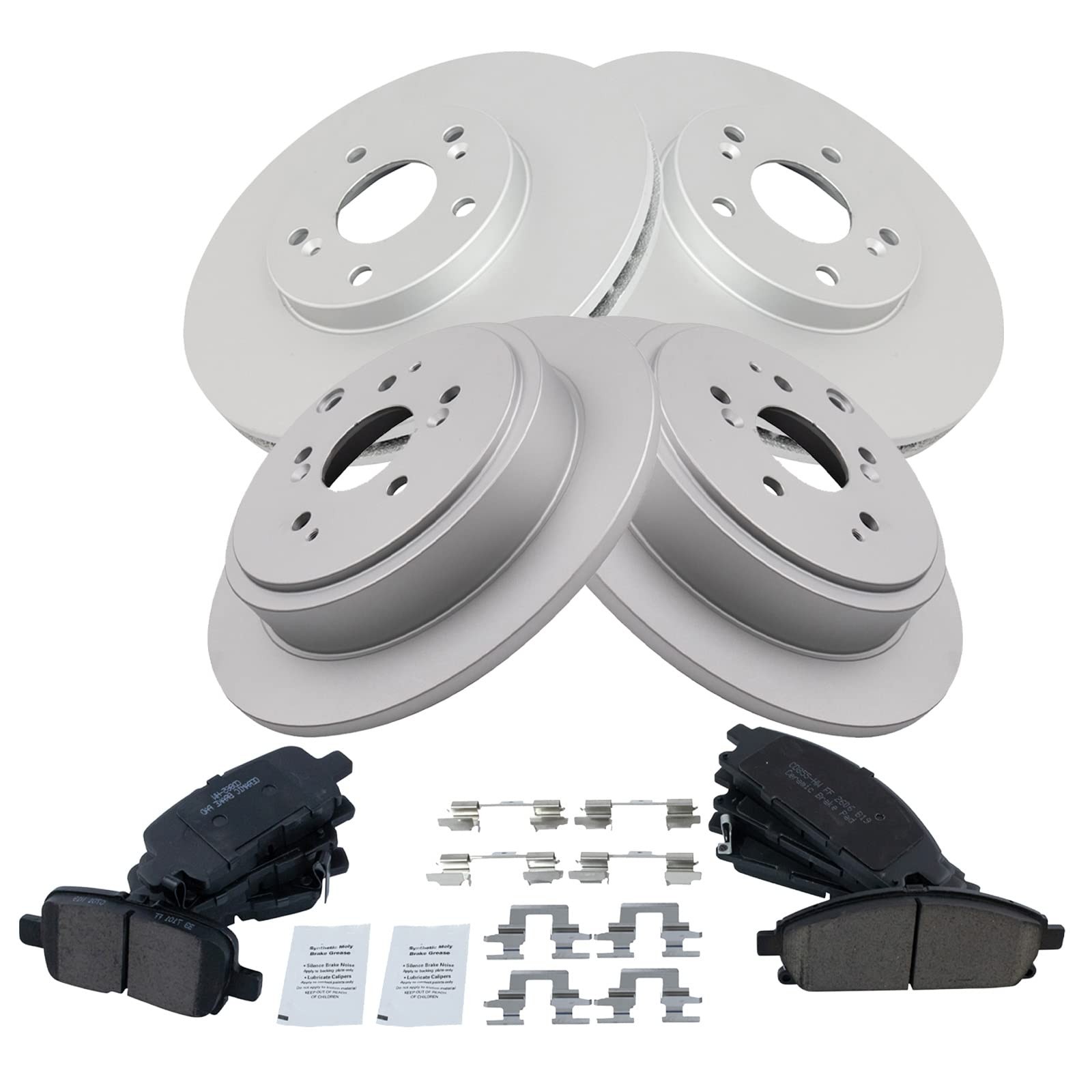 - Kit Includes: 1 Front Ceramic Brake Pad Set; 1 Rear Ceramic Brake Pad Set; 2 Front Premium G-Coated Brake Rotors; 2 Rear Premium G-Coated Brake Rotors