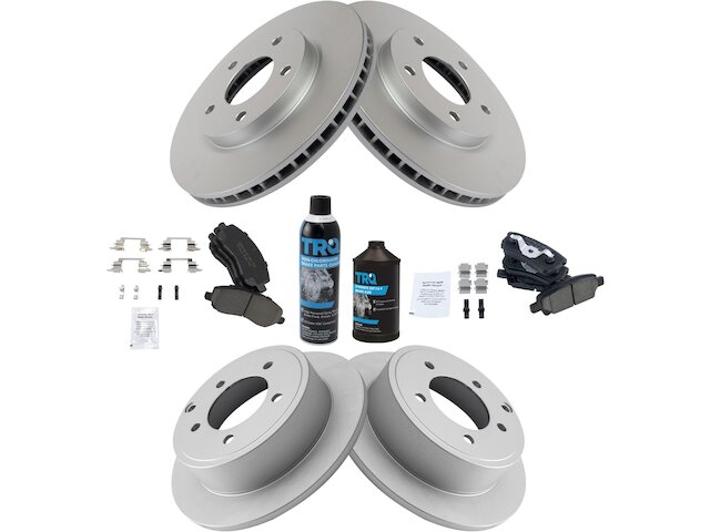 | Package Contents: | (1) 12 oz DOT 3 & 4 Brake Fluid; (1) 13 oz Non-Chlorinated 50 State Formula Brake Cleaner; (1) Front Ceramic Brake Pad Set with Contact Point Grease & Hardware; (1) Rear Ceramic Brake Pad Set with Contact Point Grease & Hardware; (2) Front G-Coated Brake Rotors; (2) Rear G-Coated Brake Rotors |