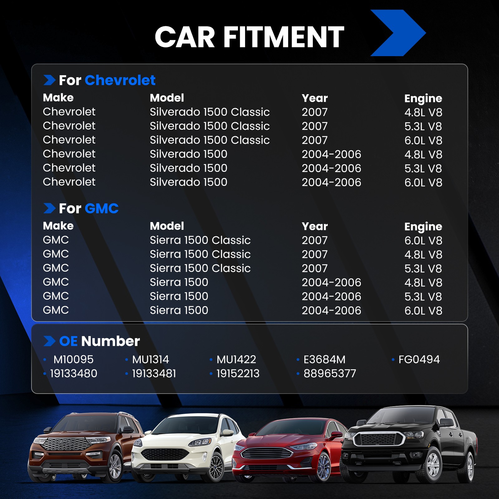 - This product fits for Chevrolet and GMC vehicles with V8 4.8L, 5.3L, and 6.0L engines from the years 2004 to 2007.