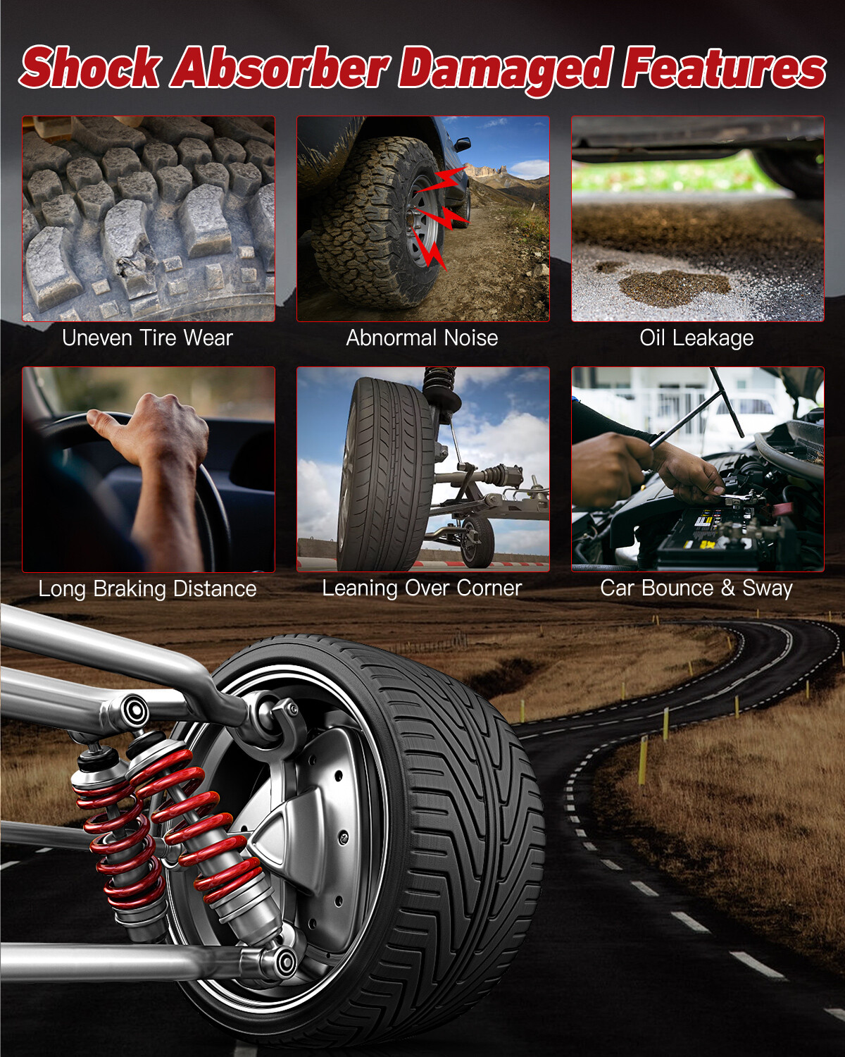 Under what circumstances will the shock absorber be replaced?? ?? The car make abnormal sound. ?? The car sink when the road is bad or load is heavy. ?? Oil Leakage. ?? The tire wear is frequent and irregular. ?? It's difficult to control the car. ?? Poor stability make you feel very uncomfortable.