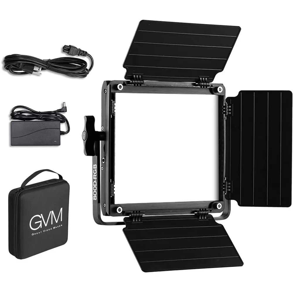 Package Lists Note: Please check the content before you purchase it. GVM 800D-RGB LED Studio Video Light 1-Panel Kit 1 x 800D RGB Video Light 1 x soft diffuser 1 x barn door 1 x power adapter 1 x power cable 1 x Handbag
