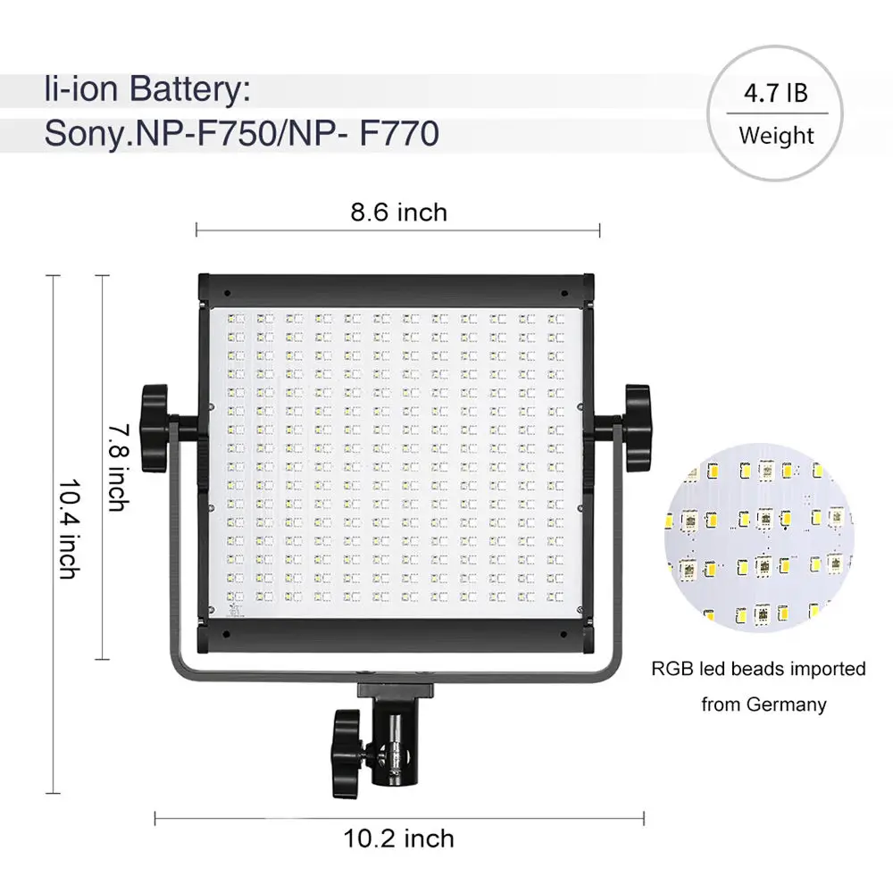 It Consists of 168 LED Beads and 84 RGB Beads: this video light is adopted the American Chip and has a life more than 100000 hours. It's designed with aerospace aluminum alloy Casing to effectively help the LED light to better dissipate heat.