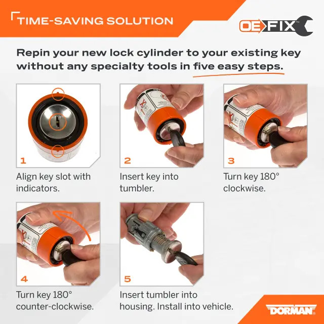 If you need to replace an ignition lock cylinder, this Dorman OE FIX solution makes it as easy as possible. An ignition lock cylinder replacement usually requires a tedious, manual recoding process. This cylinder includes a unique coding tool that allows you to easily, instantly code the new cylinder to your existing key with just a few twists of the wrist.