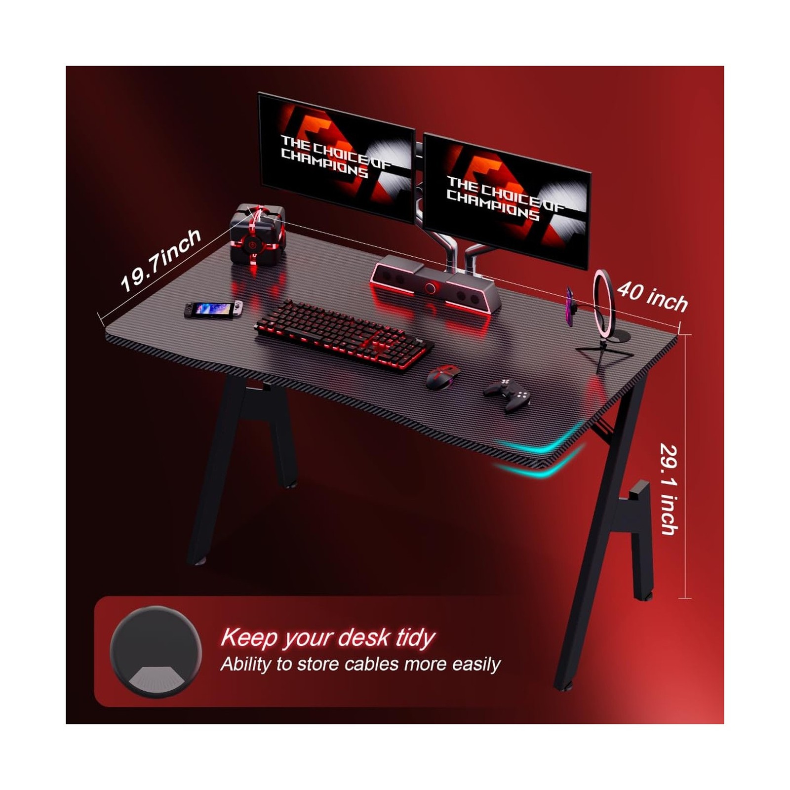 Perfect Setup The surface of the game desk is covered with carbon fiber material, which is smooth and comfortable to the touch, with a shiny and textured appearance, anti-scratch, anti-collision design, and sweatproof and waterproof, which provides you with great comfort in the process of gaming and working; We come with everything you need to take your gaming setup to the next level, including headphone hook, cupholder and double side cable grommets, players can get rid of the traditional space constraints