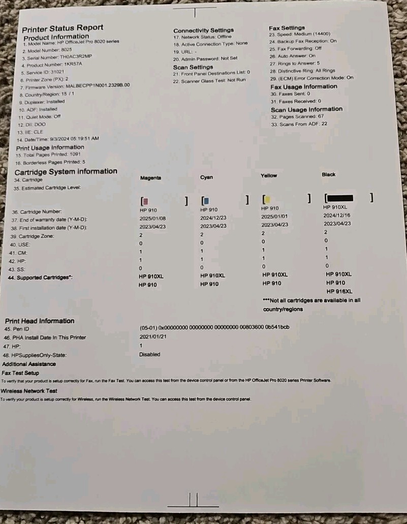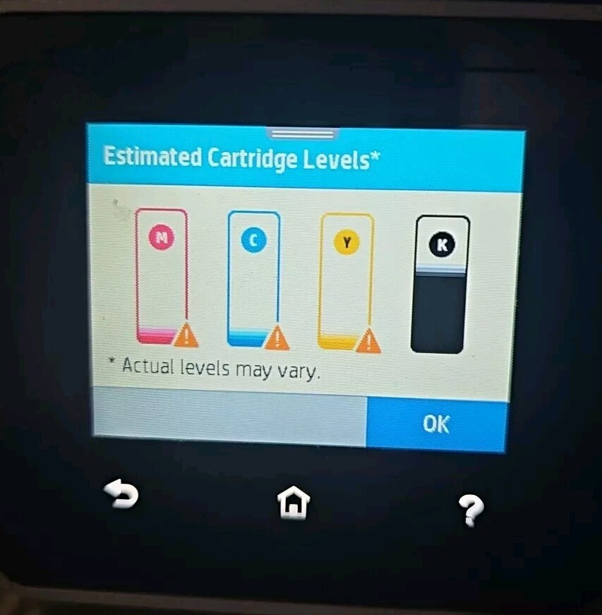HP Officejet Pro 8025e Multifunction Printer. USB, ethernet and wifi connections. Black cartridge is 2/3 full. Color inks are low but still have a little life. Duplex printing. Just over 1000 lifetime prints. All functions tested, except fax. Scan to computer, email. Color touchscreen. Compatible with Windows 7 and above. Use HP Smart App for extra features like mobile printing and faxing. Requires HP account and internet connection to print. Great for home or small office printing. All printers ship with extra bubble wrap and packaging for safe transport.