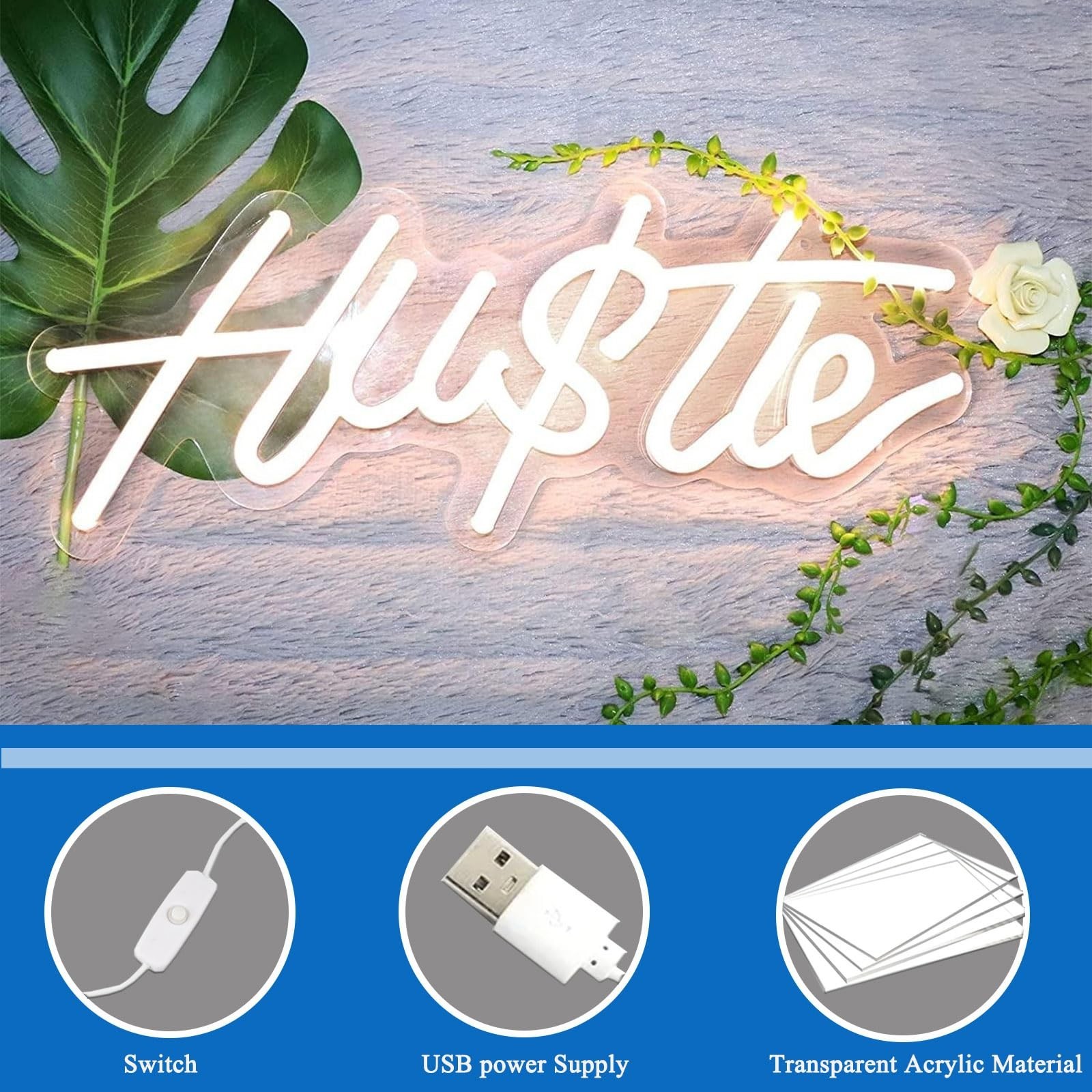 - Versatile Wall DecorThe HUSTLE neon sign is not only a stylish piece of decor but also a versatile addition to any room. Its sleek design and modern aesthetic make it suitable for various settings, such as bedrooms, living rooms, offices, bars, and more. Transform your walls into an artistic canvas with this statement neon sign.