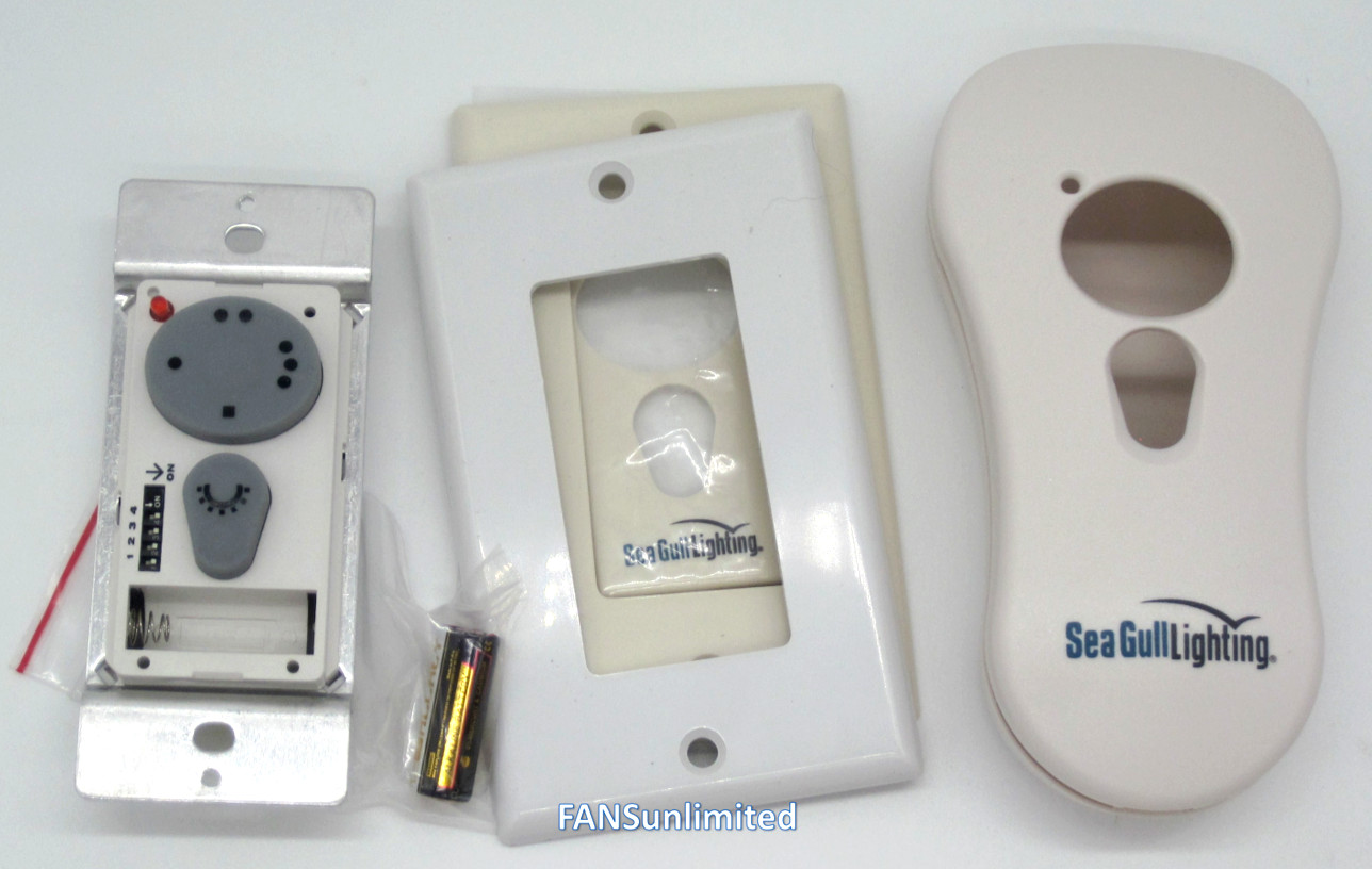 Seagull Lighting innovative hand-held and wall remote control transmitter and receiver kit. This transmitter delivers added flexibility of use as a wall mount remote OR hand-held unit. Canopy installed receiver converts pull chain fan to remote capability. Features: Three speed and downlight control Almond or white face plates "Clam-Shell" design enclosure for use as hand-held option Battery operated transmitter, no hardwiring required.