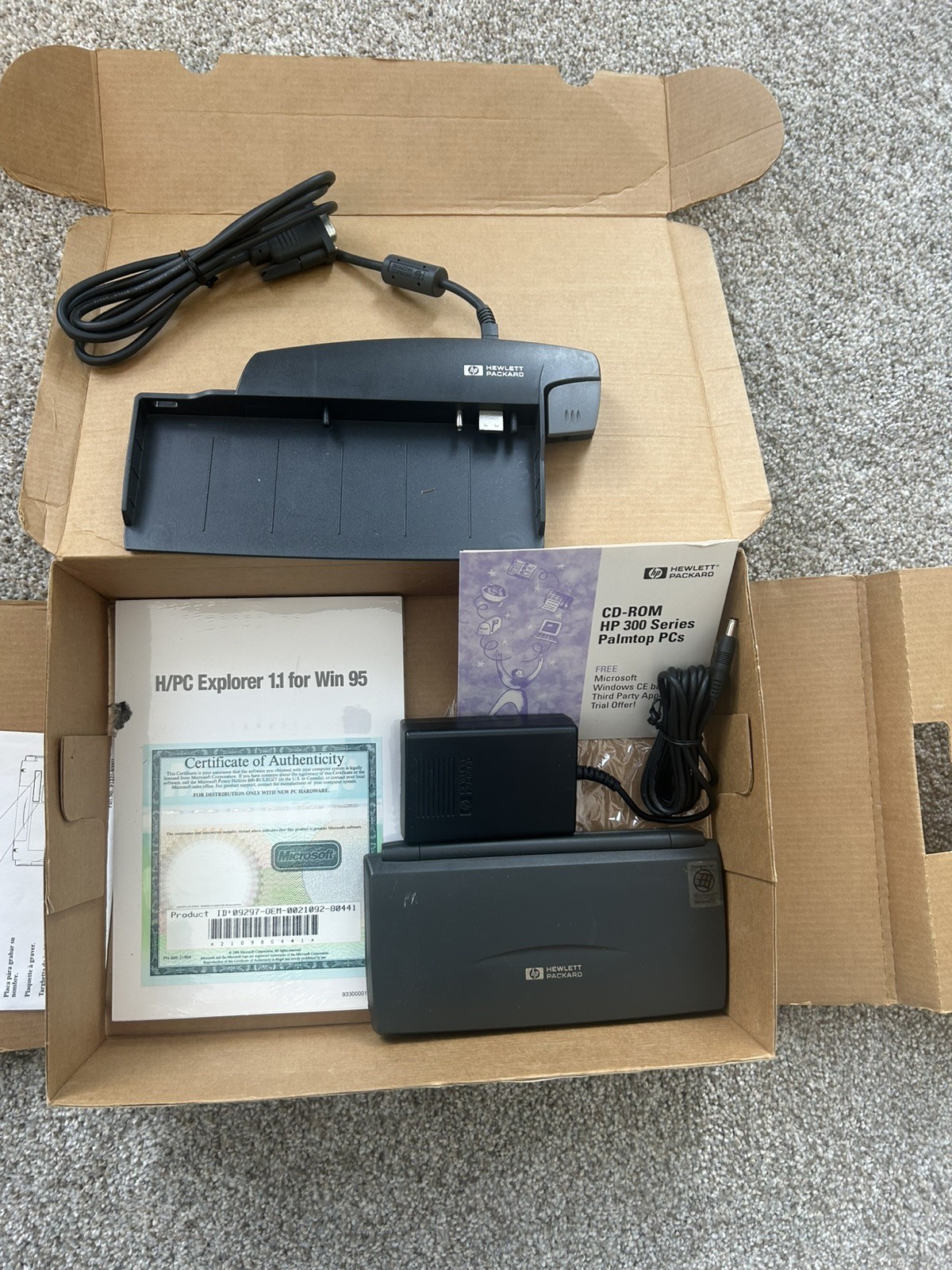 Never-been-used Hewlett Packard 320LX Palmtop PC with dock and charger. In original box. Tested and works. Collector item!