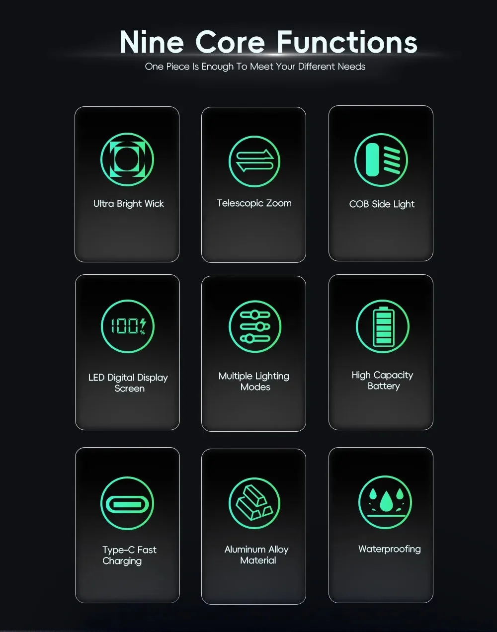 Main Light: 5 modes(Strong light-Medium light-Low light-Explosive flash-SOS