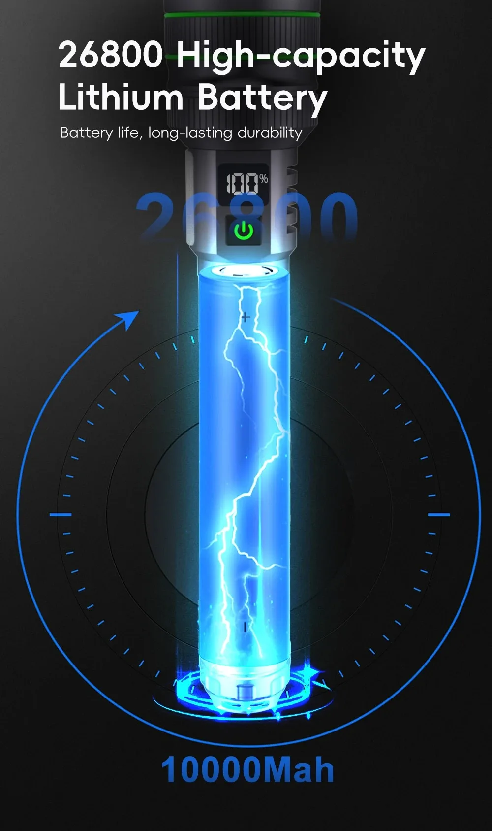 Battery: Built in a ultra-large capacity 26800 parallel battery pack,ensuring long-lasting illumination during your outdoor adventures.