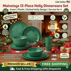 Mainstays Green Holly 12-Piece Plastic Dinnerware Set – NEW Christmas Holiday