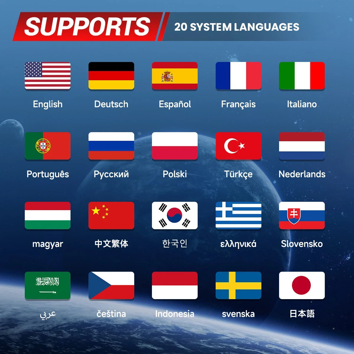 English, French, German, Italian, Spanish, Portuguese, Japanese, Russian, Dutch, Hungarian, Slovak, Greek, Arabic, Czech, Polish, Chinese traditional, Korean, Turkish, Danish)