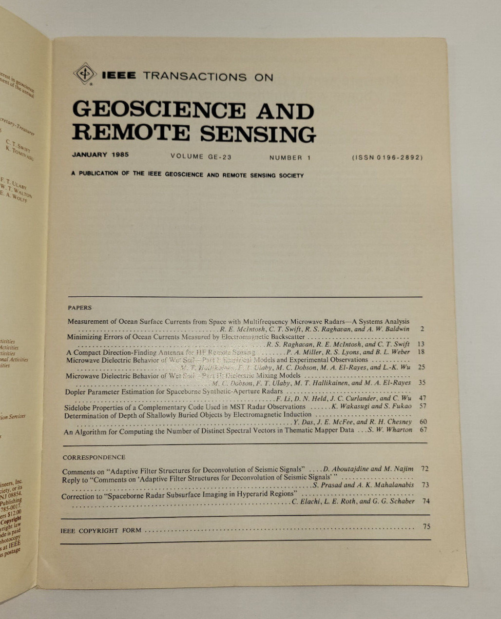 IEEE Transactions on Geoscience Remote Sensing January 1985 Volume GE-23 Num 1