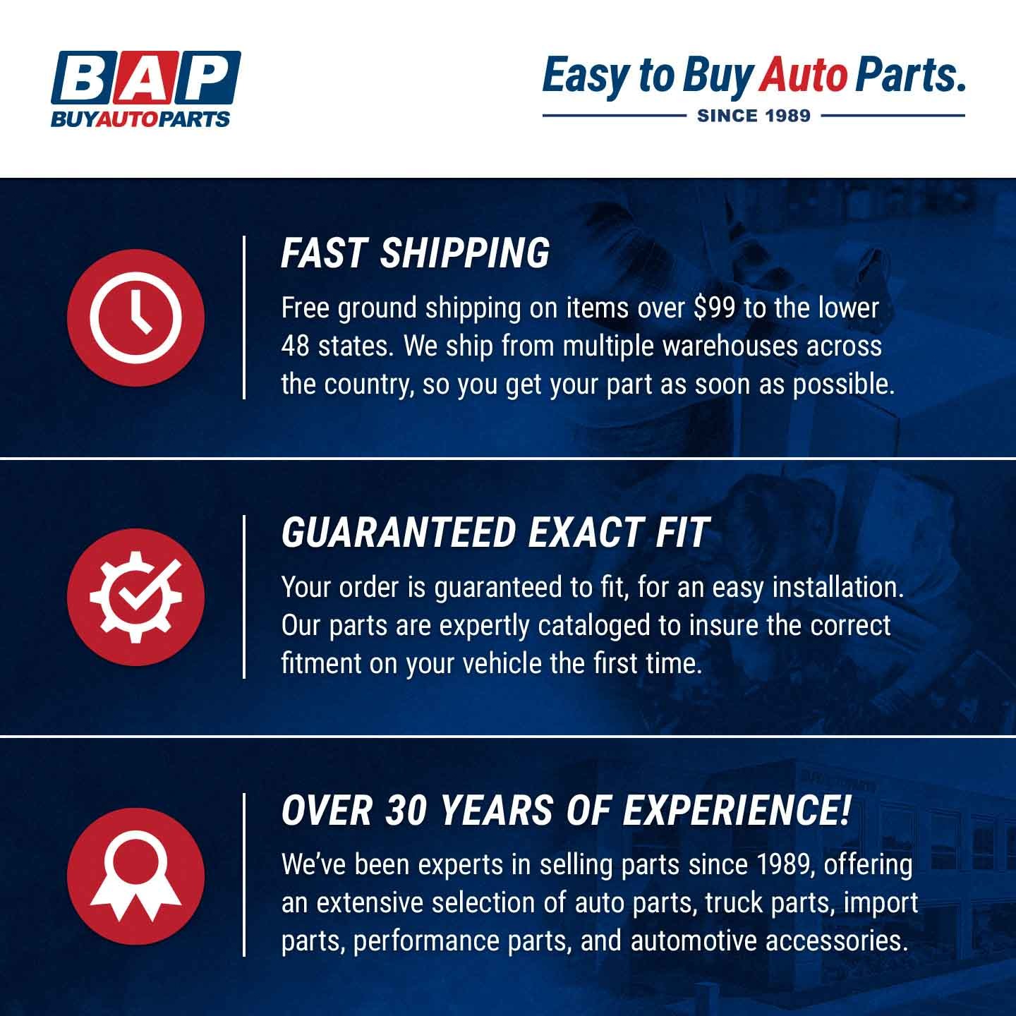 BuyAutoParts has offered an extensive selection of auto parts, performance parts, and automotive accessories since 1989.