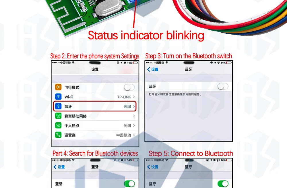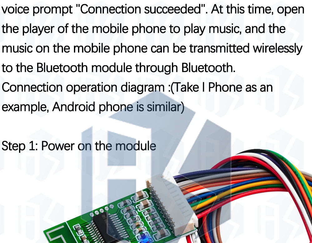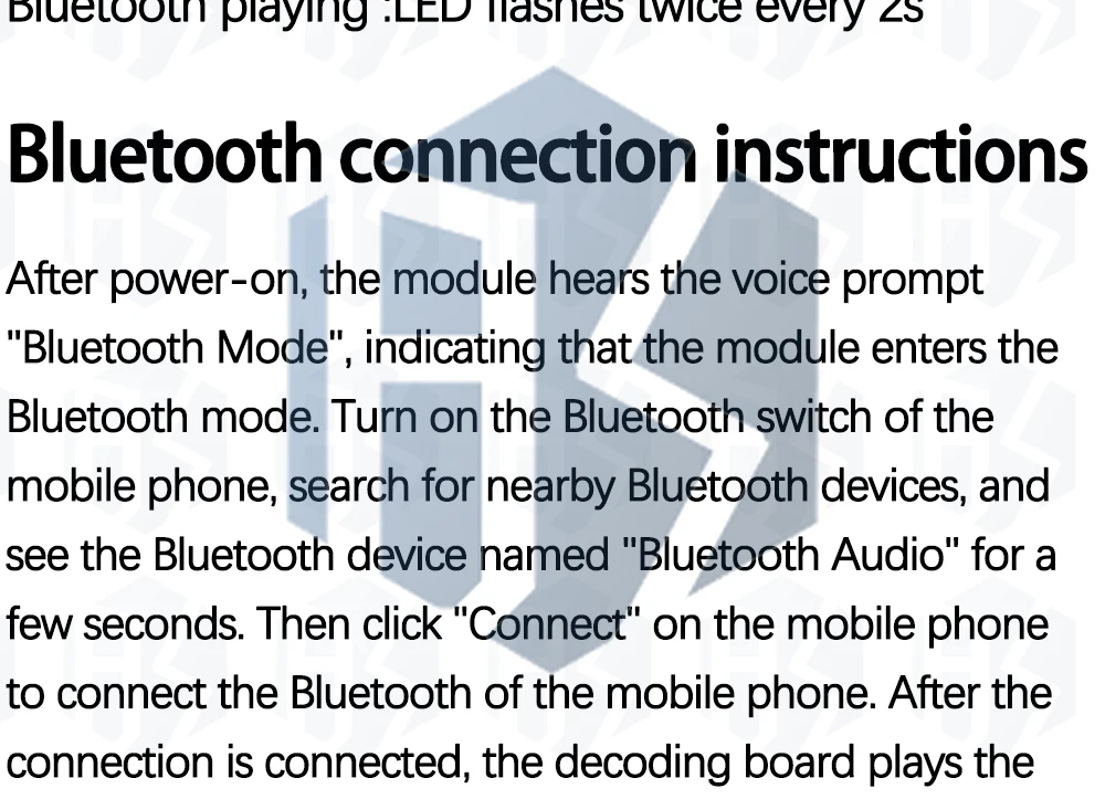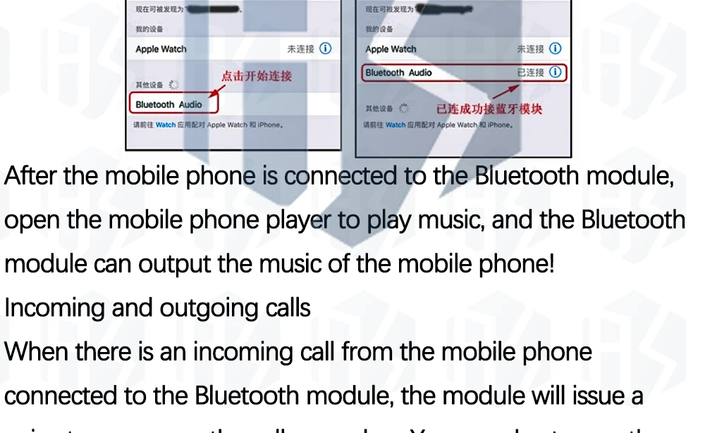After power to hear a voice prompt "Bluetooth mode", which means the module into the Bluetooth mode, and opening mobile phone Bluetooth switch. Then searching for nearby Bluetooth devices after a few seconds, you will see the equipment named "Bluetooth Audio" Bluetooth device, click on the link in the mobile phone side can connect Bluetooth mobile phone.