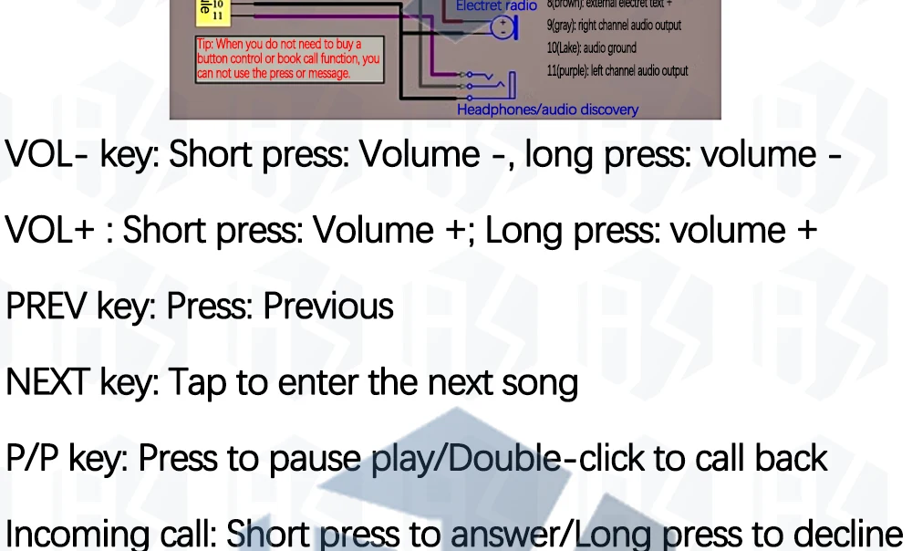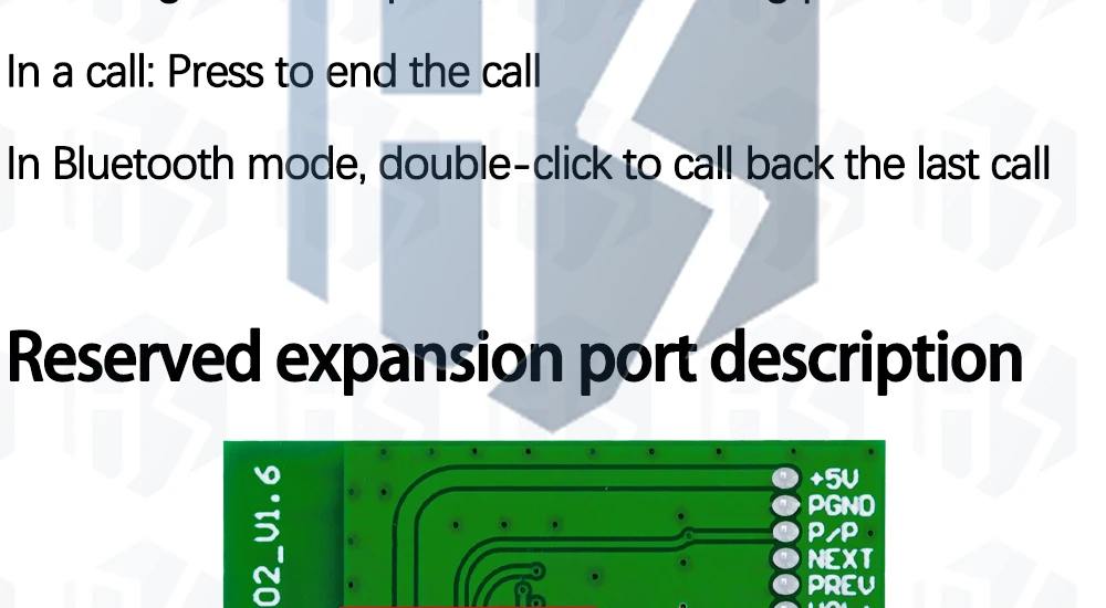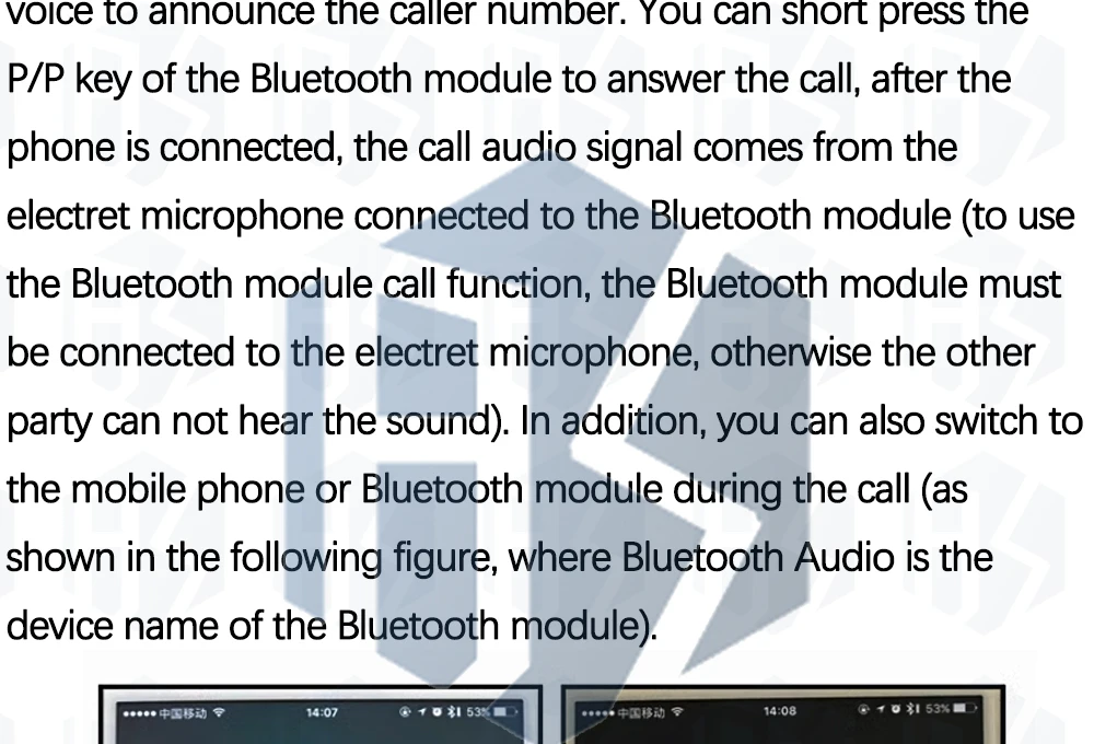 When a mobile phone with a Bluetooth module has an incoming call, the module sends out a voice to broadcast the caller's call number. You can answer the call of the Bluetooth module short press P/P key, after the call, call audio signal from the Bluetooth module external electret microphone (to use the Bluetooth module calls the Bluetooth module to connect the electret microphone, otherwise they can not hear the sound). In addition, you can switch to any phone or Bluetooth module during the call process.