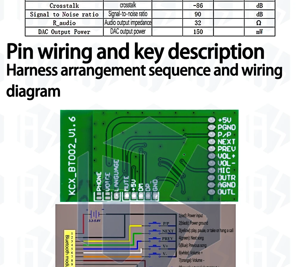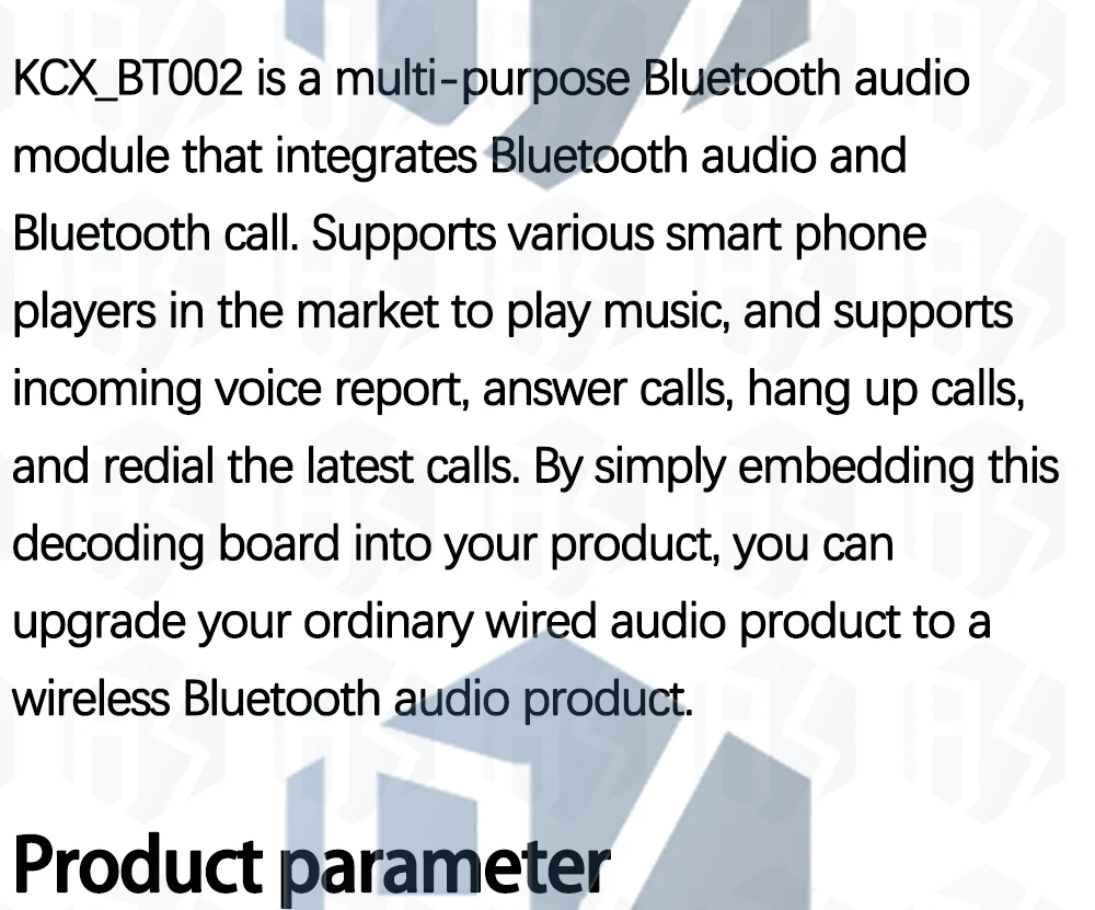 KCX_BT002 is a audio module that integrates Bluetooth, audio and Bluetooth phone calls. It supports the market, all kinds of intelligent mobile phone player to play music, voice calls, telephone / hang up call / redial last call function.