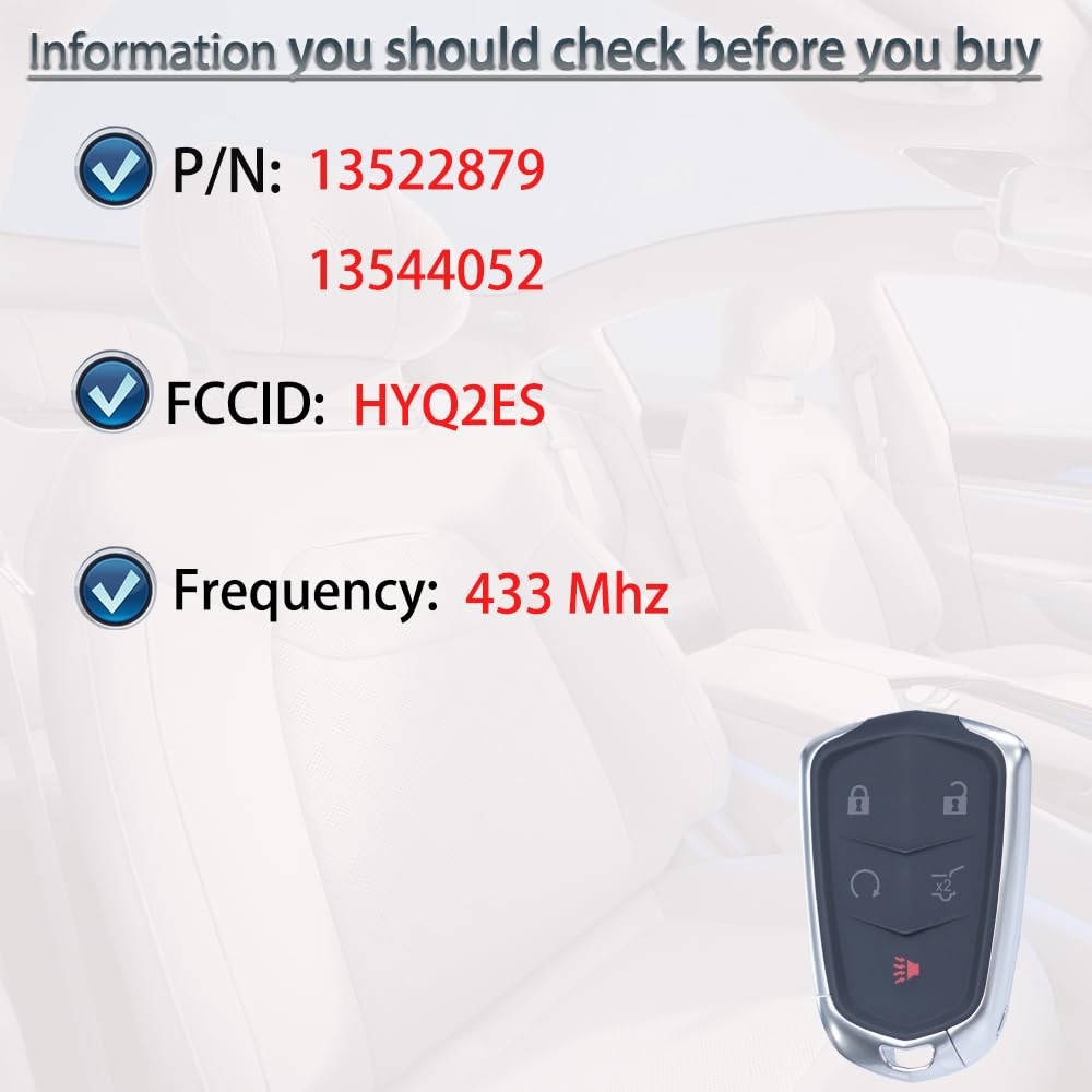 【Replacement 】For Remote fob P/N: 13522879, 3544052; FCC ID: HYQ2ES (Check your OEM key' backside has this information); Frequency: 433MHz; Key Fob Replacement Suitable for 2020-2023 CADILLAC XT4 / XT5 / XT6.