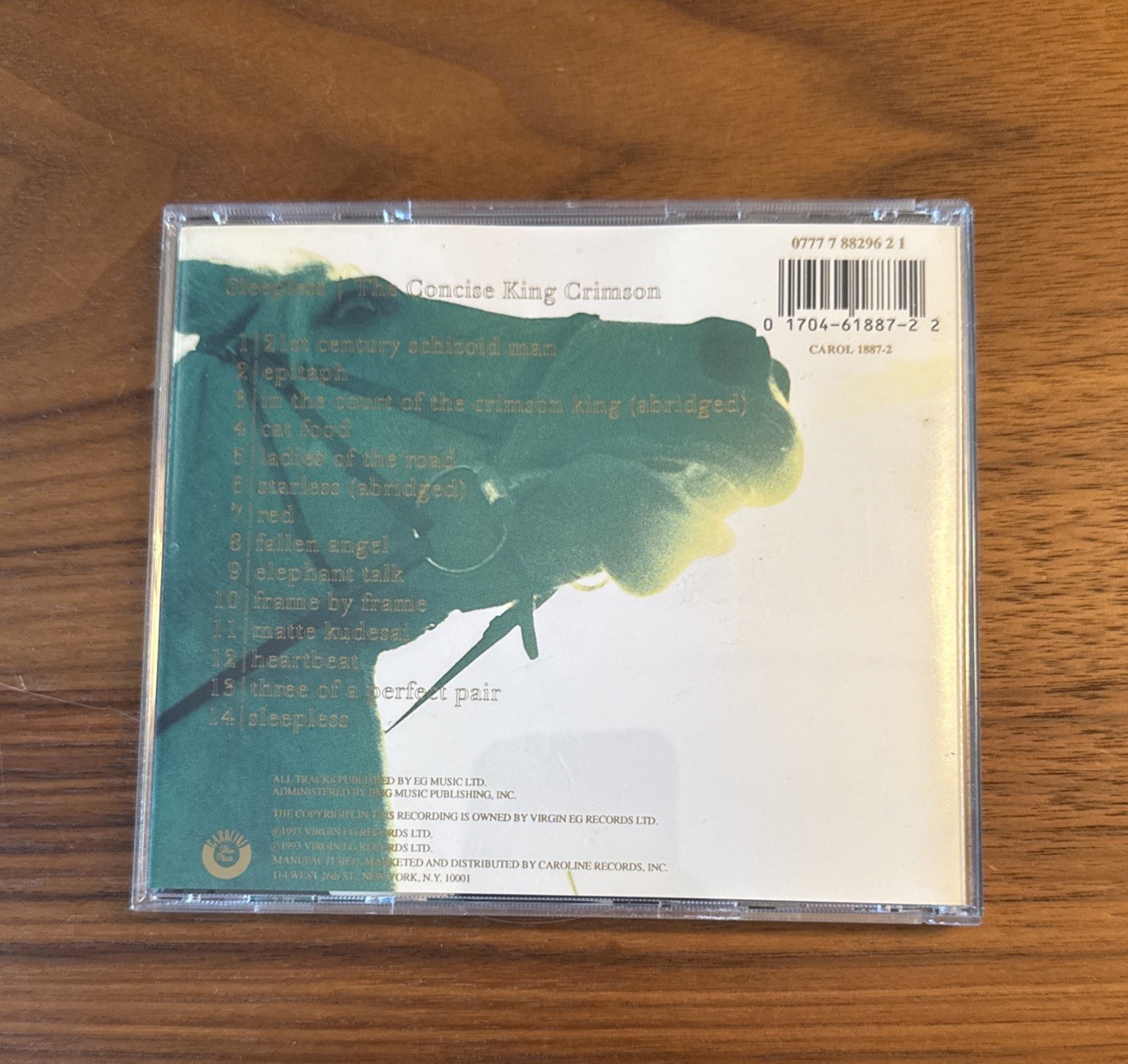 The "King Crimson - Sleepless: The Concise King Crimson CD" is a compilation album released in 1993 by Caroline Blue Plate. The red-colored CD showcases the progressive/art rock style of King Crimson, featuring a selection of rock and art rock songs that encapsulate the band's iconic sound. This concise collection of music offers listeners a snapshot of the band's innovative and experimental musical approach, making it a must-have for fans of King Crimson's discography.