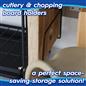 This rack also comes with additional storage units for cutlery, utensils and chopping boards that can be easily hooked over the side.