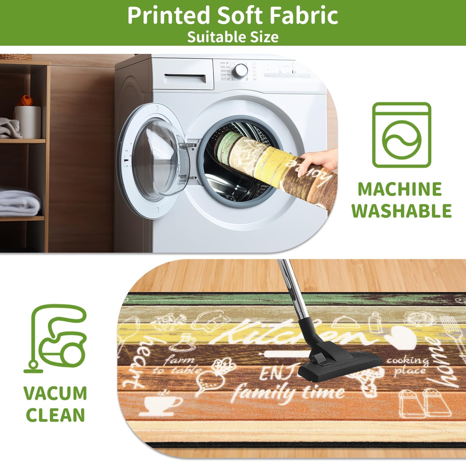 【Machine Washable Rugs】: Cleaning is a breeze! Simply toss it in the washing machine, vacuum, or spot clean spills. Our area rugs for kitchen colorfast fabric resists fading, staying bright and fresh wash after wash. Ideal for busy households! (Tip: Use cold water & mild detergent. Avoid bleach.)
