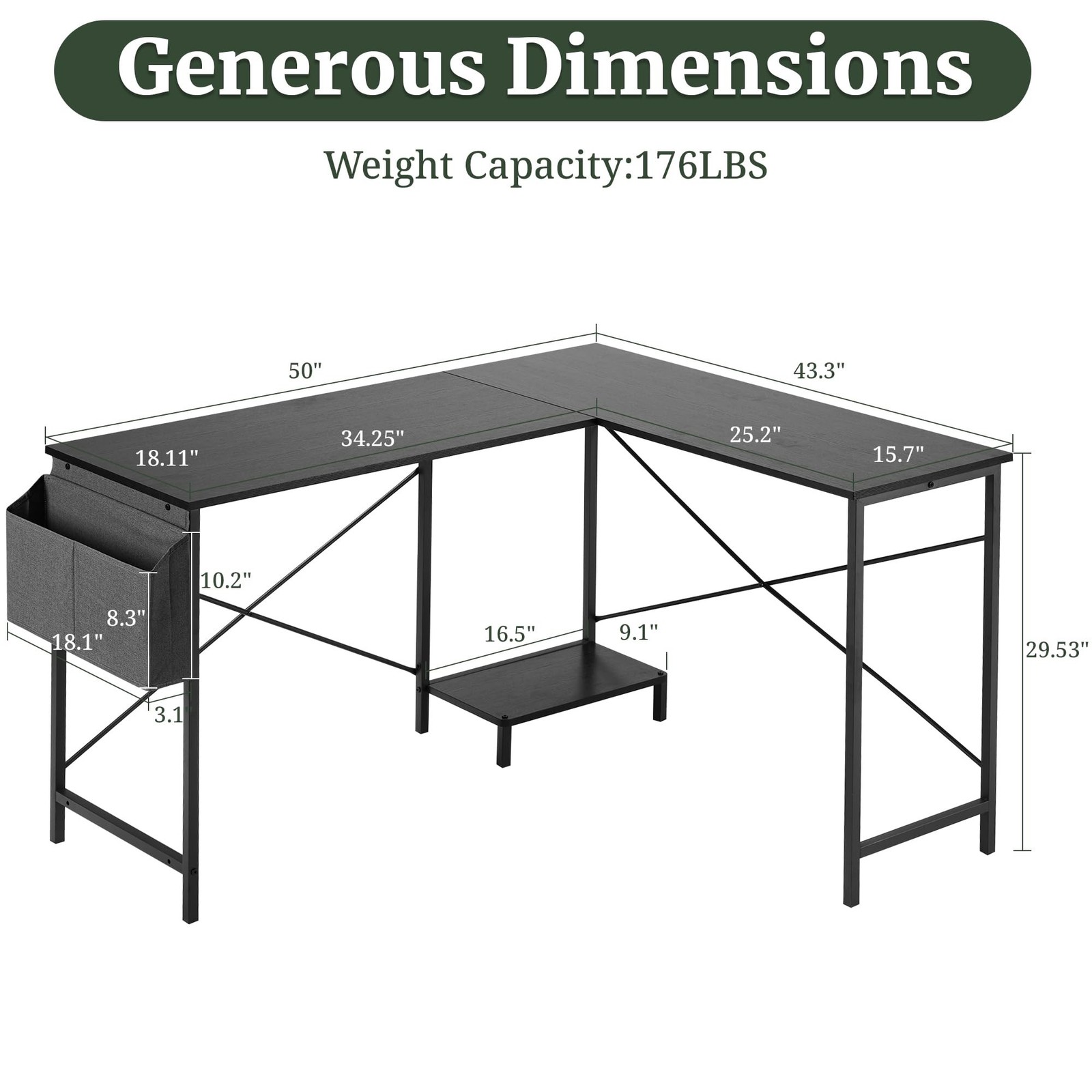 - Reversible L Shaped Desk for Any Room: This 50 inch L shaped computer desk is fully reversible, letting you assemble the short side on the left or right to fit your corner space. Ideal for home office, dorms, or gaming setups where space-saving is key.