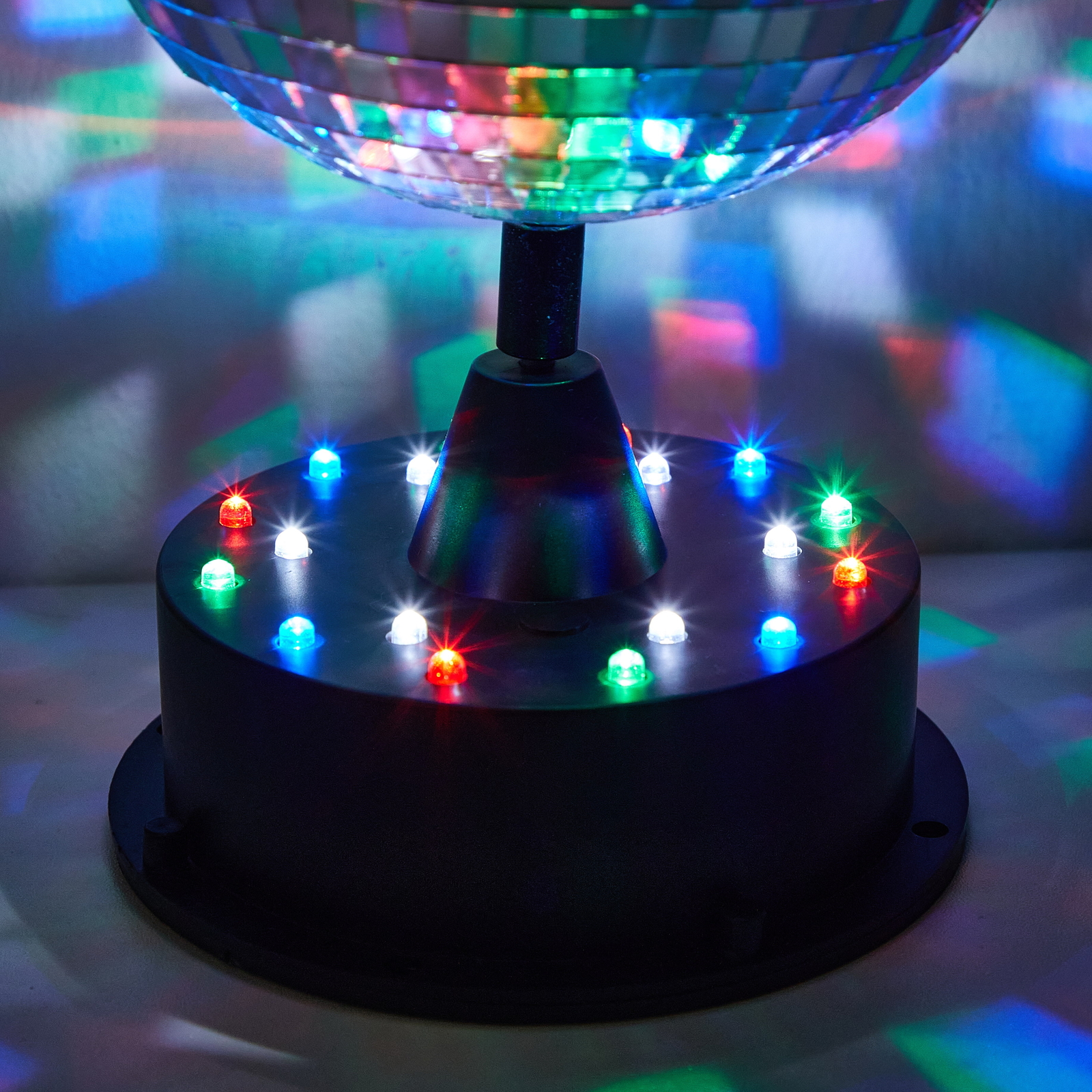 - Features a rotating mirror disco ball for dynamic light displays