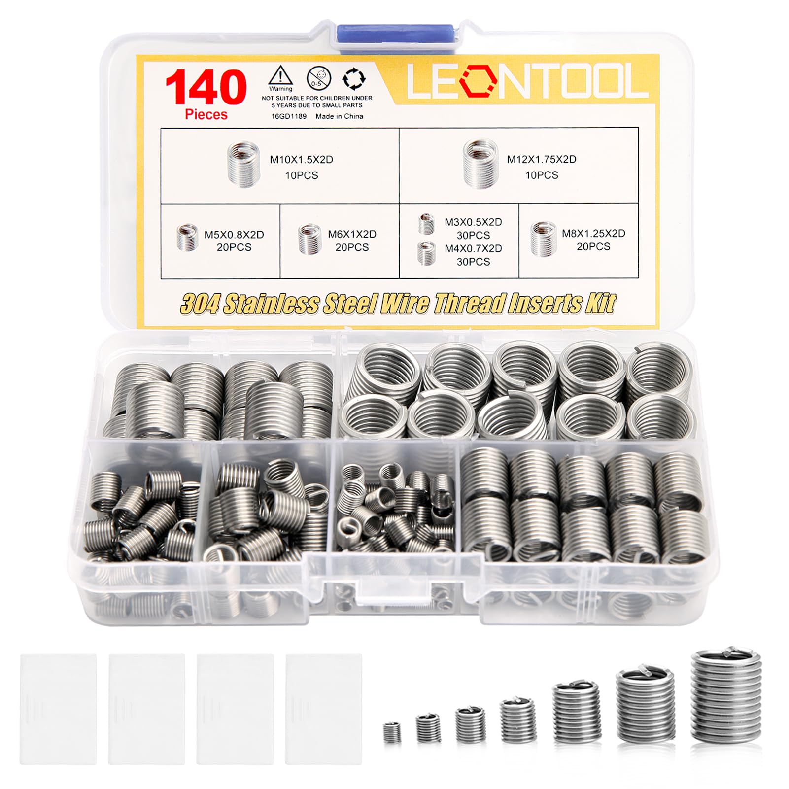 The kit contains 7 kinds of size: M3 x 0.5 x 2D(30Pcs); M4 x 0.7 x 2D(30Pcs); M5 x 0.8 x 2D(20Pcs); M6 x 1 x 2D(20Pcs); M8 x 1.25 x 2D(20Pcs); M10 x 1.5 x2D(10Pcs); M12 x 1.75 x 2D(10Pcs).Totally 140 piece wire screw sleeve. 10-compartment transparent storage box(1Pc).