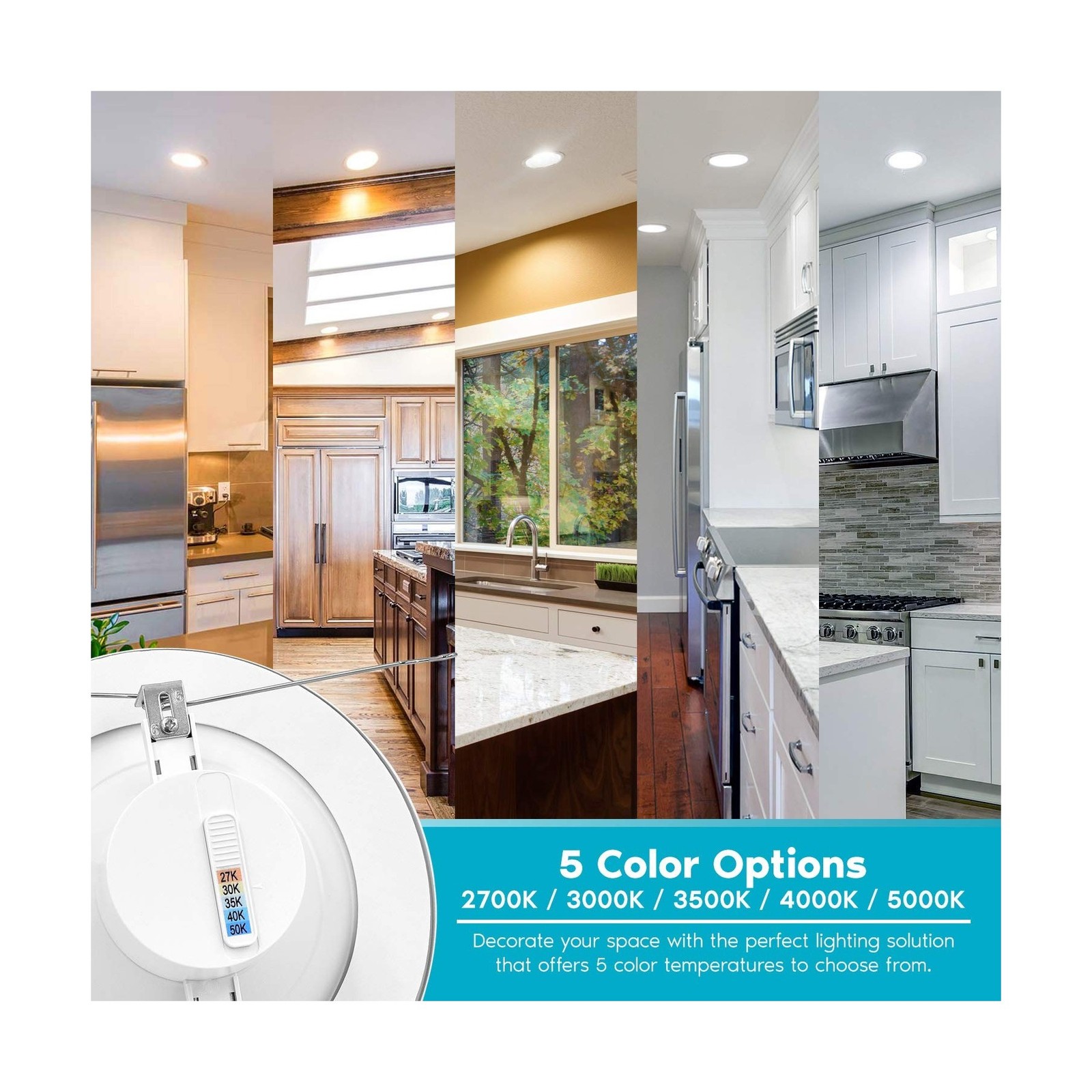 - 5 Color Options - Not sure what recessed lighting color temperature you are looking for in your home? Each 5 / 6 inch dimmable Led downlight has a simple to use switch on the back that can change your lights to 2700K warm white, 3000K soft white, 3500K natural white, 4000K cool white, or 5000K bright white. Your home ceiling can lights will be adjustable through 5 color temperatures until you find the perfect light to select for your space.