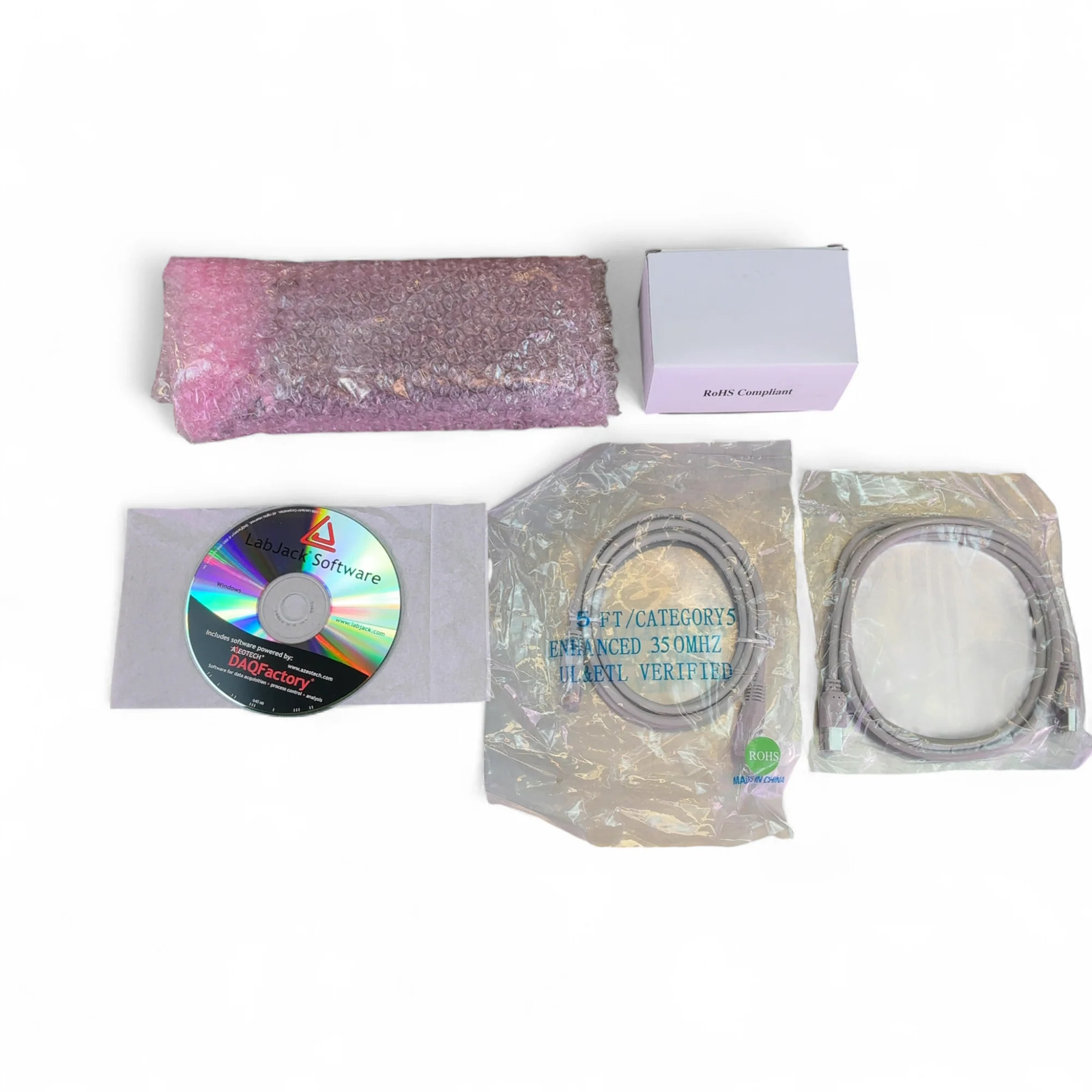 Includes: 1x LabJack UE9 module, 1x LabJack Software CD, 1x Ethernet cable, 1x USB cable, 1x power adapter with multiple international plugs, 1x Quickstart Guide, 1x screwdriver