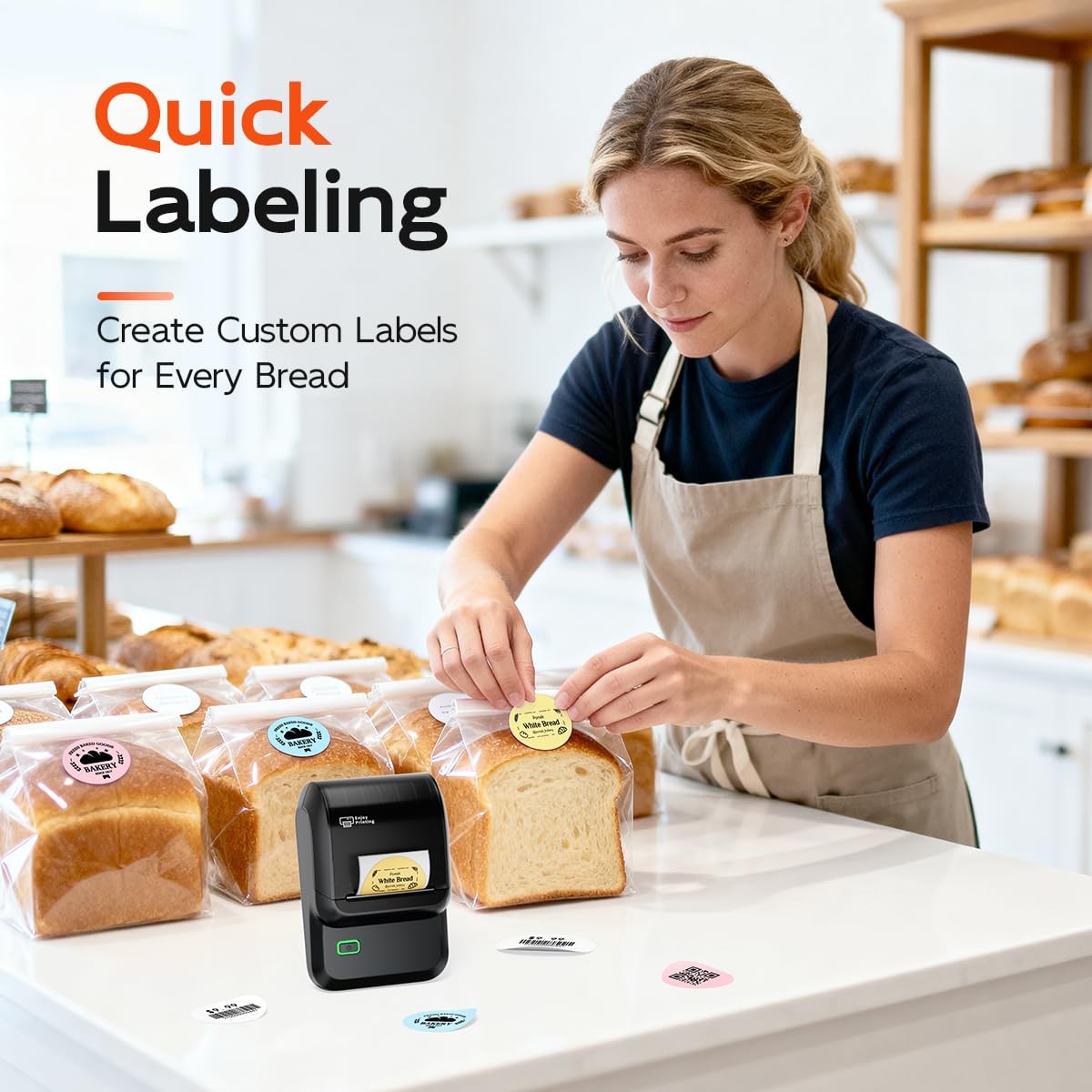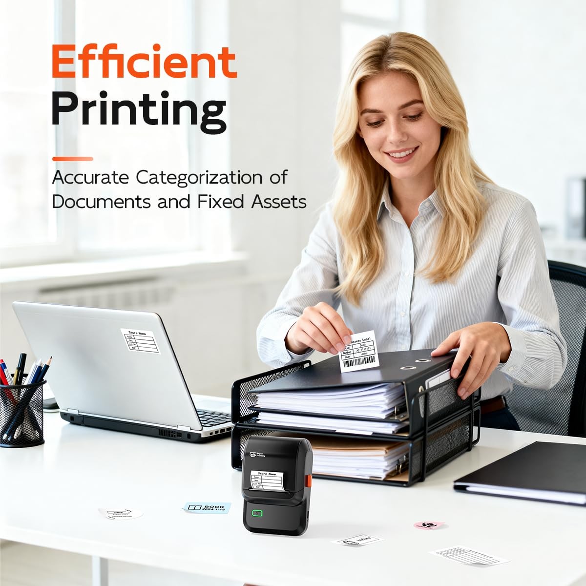 For Home and Small Business : The M100 label maker machine with tape supports printing 0.78-2 inch wide, ideal for small business (product information, price tags, barcode,address labels, jewelry tags),home (food, storage bins, drawers, pantry, containers, spices jar),office and school supplies (folder, documentation, asset Tag, cable label, name tag)