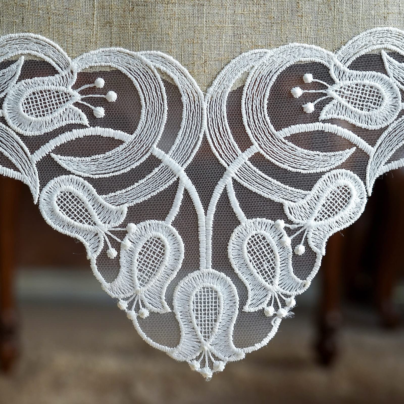 MATERIAL: Exquisite polyester lace, the vintage table runner/dresser runner is made of heavy duty lace and makes it drape beautifully