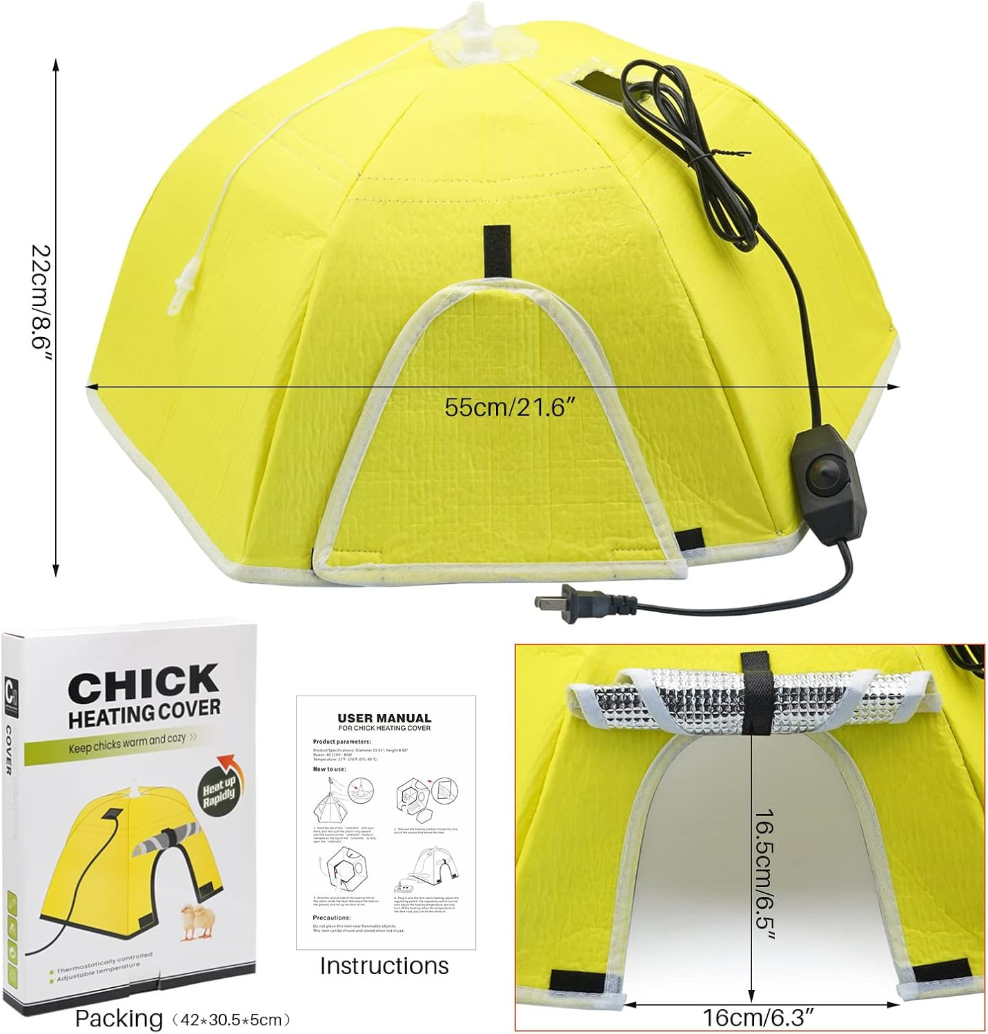 - Keep Warm: Keeps your chicks warm during the cold winter. Power: AC110V-80W, temperature of heating pad: 32℉-176℉(0℃-80℃).