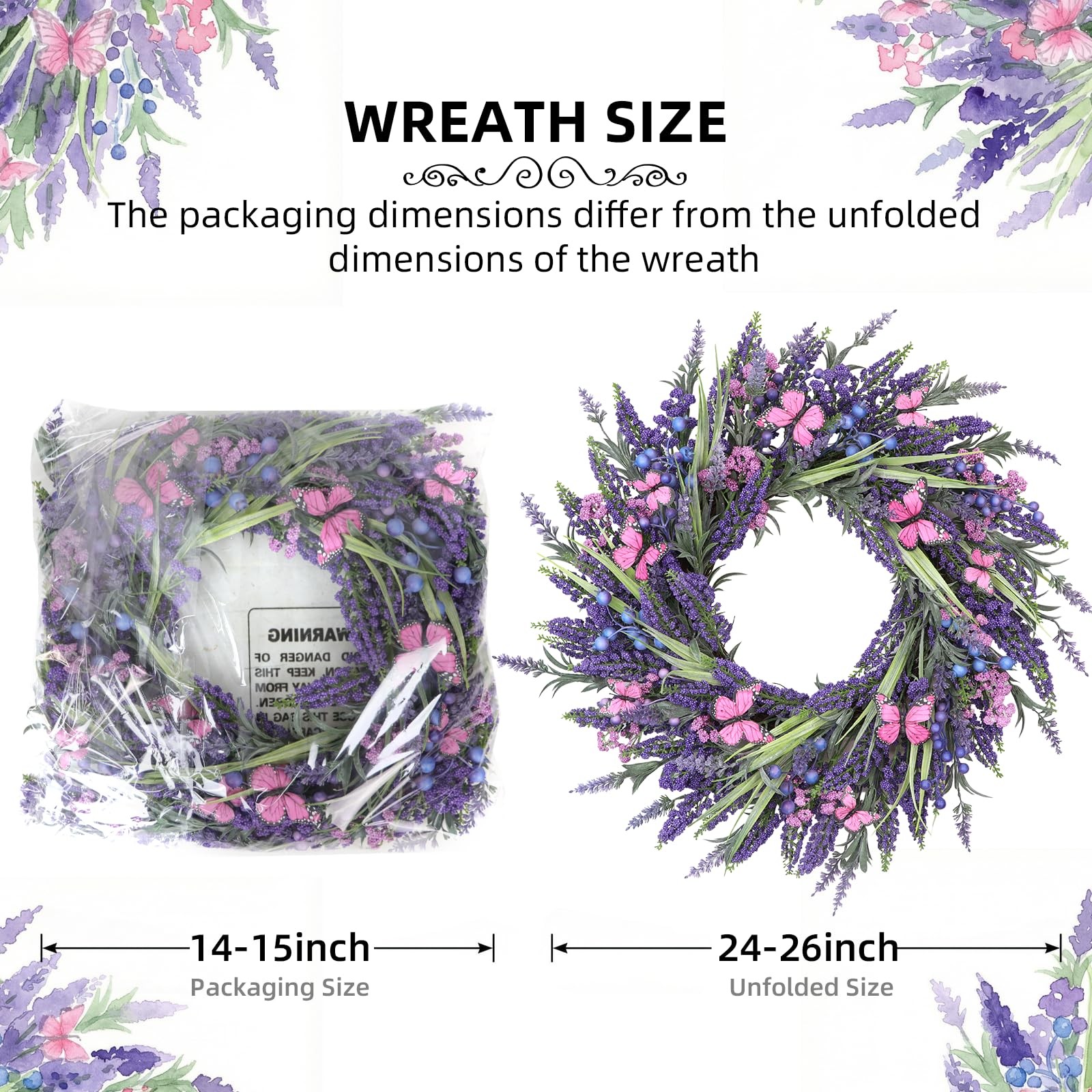 【 24 Inch Lavender Wreath】 The size of this decorative wreaths for front door is moderate, it can be easily hung anywhere, and it is suitable for a variety of different decoration needs. Whether you want to hang it on a door, wall, ceiling, place it on a table or use it as a photo background, it will show its charm perfectly No maintenance required.
