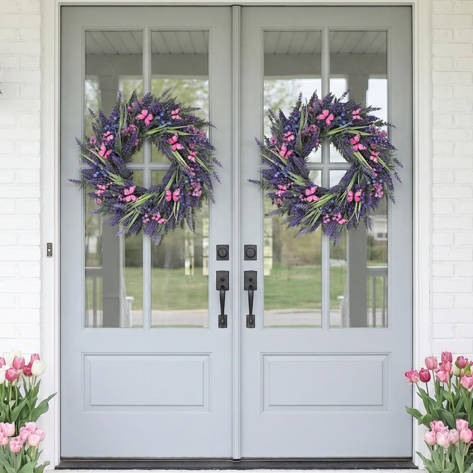 【Exquisite and exquisite】 This decorative spring wreaths for front door pays attention to details in the design, using exquisite Lavender and Realistic Butterfly,Use of large/small berries for garnish, bright colors, full of vitality and vitality, making your home decoration more lively and interesting.