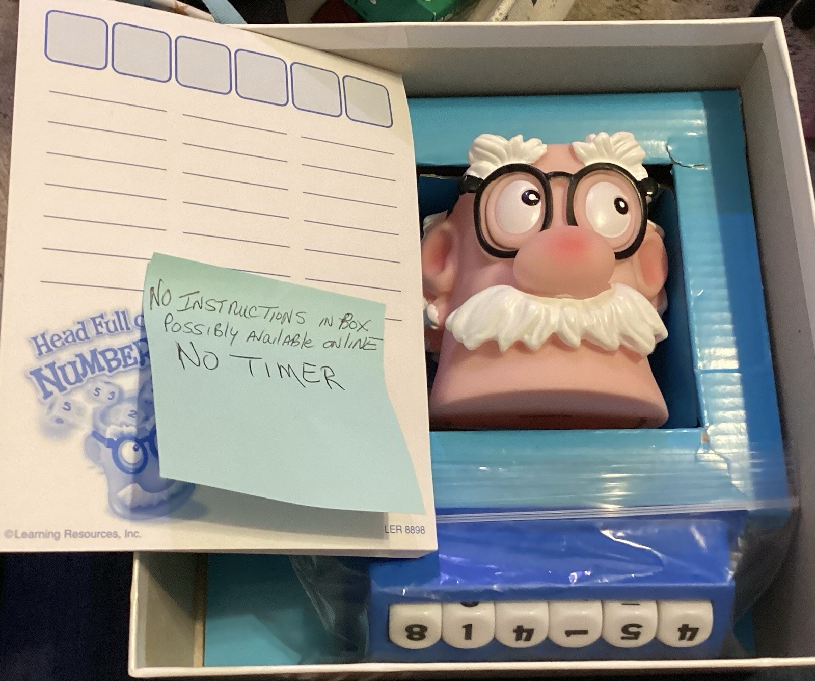Create fun while helping your child's math skills with the Learning Resources Head Full Of Numbers Math Game. This educational toy is designed to offer a fun and interactive way to learn math concepts. This game is suitable for children aged 8 years and above. The game is a Preloved game no instructions please review pictures does not have the hourglass timer .