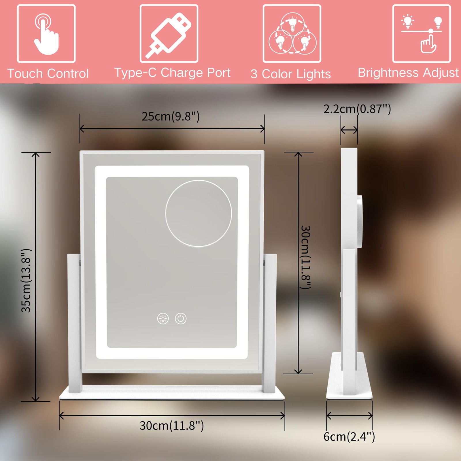This vanity mirror with lights is the perfect addition to any makeup routine. Featuring high-quality LED bulbs, it offers three adjustable lighting modes—warm white, natural white, and cool white—so you can choose the perfect light for any look. The mirror also includes a detachable 5X magnifying mirror, ideal for detailed tasks like tweezing or applying eyeliner. Compact yet sturdy, this makeup mirror with lights is designed for tabletop use and is the perfect size for small vanity spaces. Its sleek frame adds a modern touch to your vanity, while the included charger ensures you’ll never run out of power. Whether you're perfecting your daily makeup or creating a flawless look for special occasions, this lighted makeup mirror with magnification provides the ideal lighting and precision for every detail.
