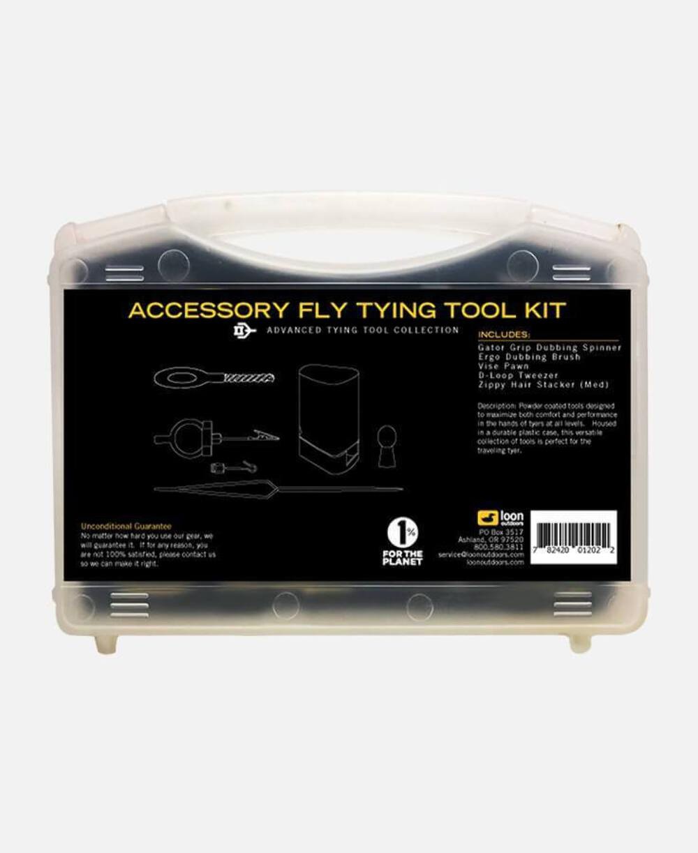 Packaged in a heavy duty travel case and featuring the Gator Grip Dubbing Spinner, D-Loop Tweezers, Ergo Dubbing Brush, Zippy Hair Stacker (M) and a Vise Pawn, this is kit for anyone looking to beef up their arsenal of fly tying tools.