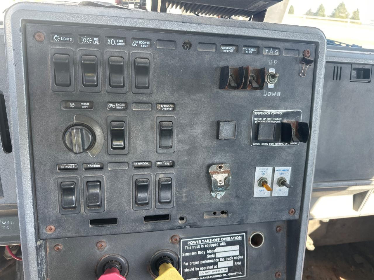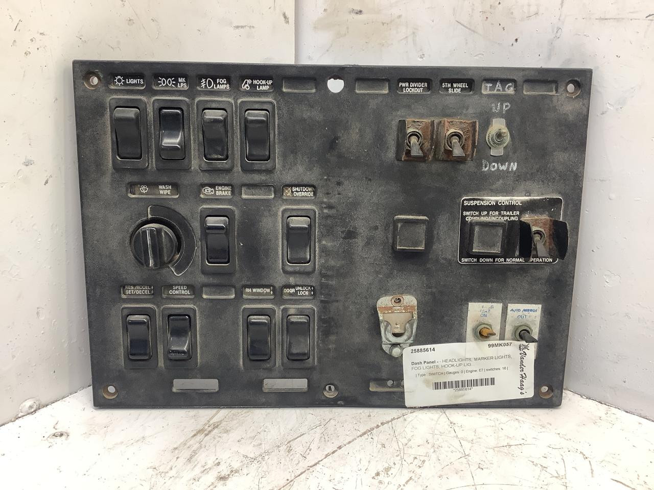 Used Mack CH600 Dash Panel for sale, from a 1999 Mack CH600 Truck. HEADLIGHTS, MARKER LIGHTS, FOG LIGHTS, HOOK-UP LIGHTS, WASH/ WIPE, ENGINE BRAKE, DOME LIGHTS, SHUTDOWN OVERRIDE, RES/ACCEL SET/ DECEL, SPEED CONTROL, DIFF DIVIDER, 5TH WHEEL SLDIE, TAG UP AND DOWN FAN OVERRDIE, ON/OFF, MIRROR HEAT, RH MIRROR POWER.