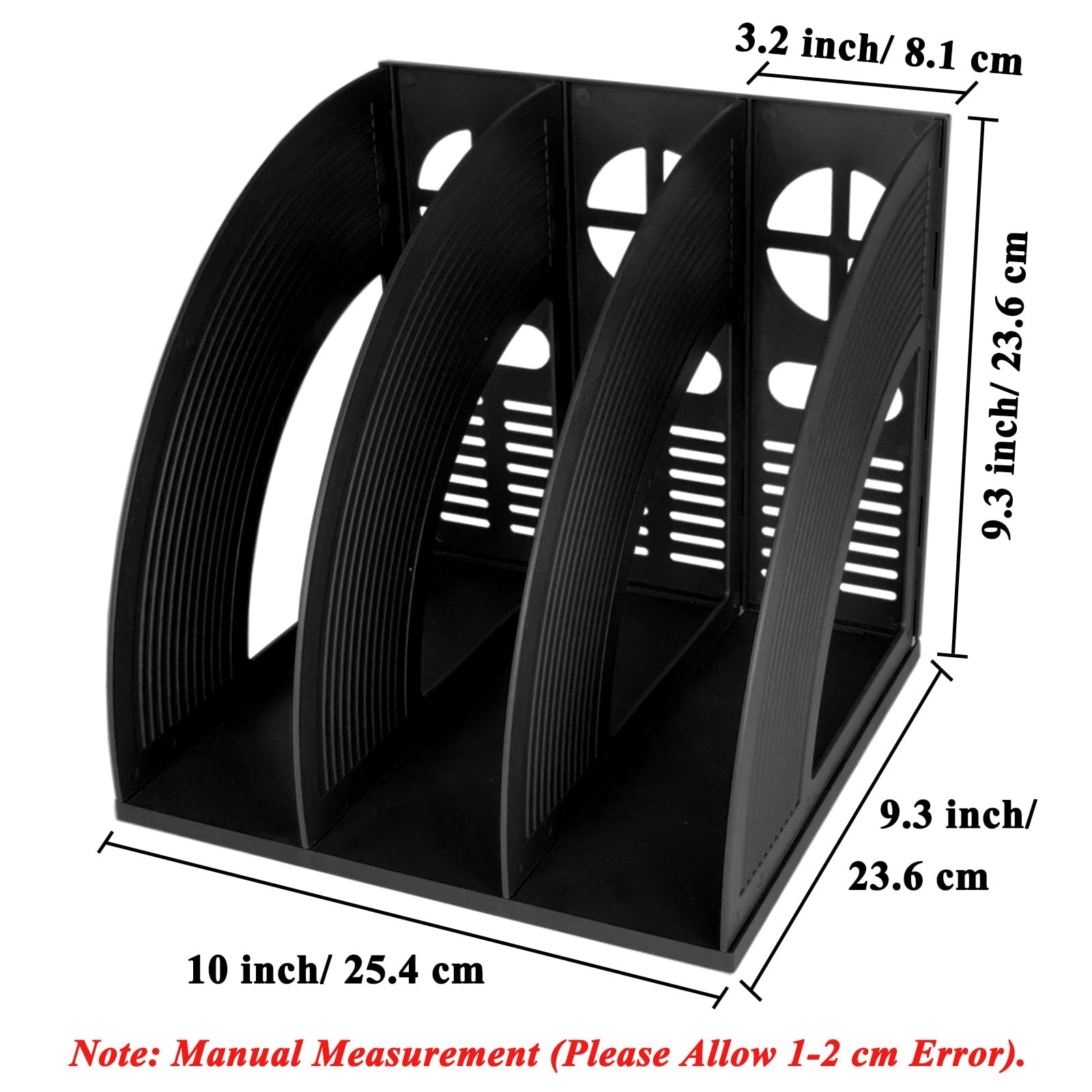 - LARGE CAPACITY: SIZE: 10x9.3x9.3 inch. The magazine file holder with 3 vertical compartments is easy to sort and allows you to quickly find your files. Each Compartment Width: 3.2 inch. The large capacity magazine rack keeps files upright, saves space and keeps your desktop neat and organized.