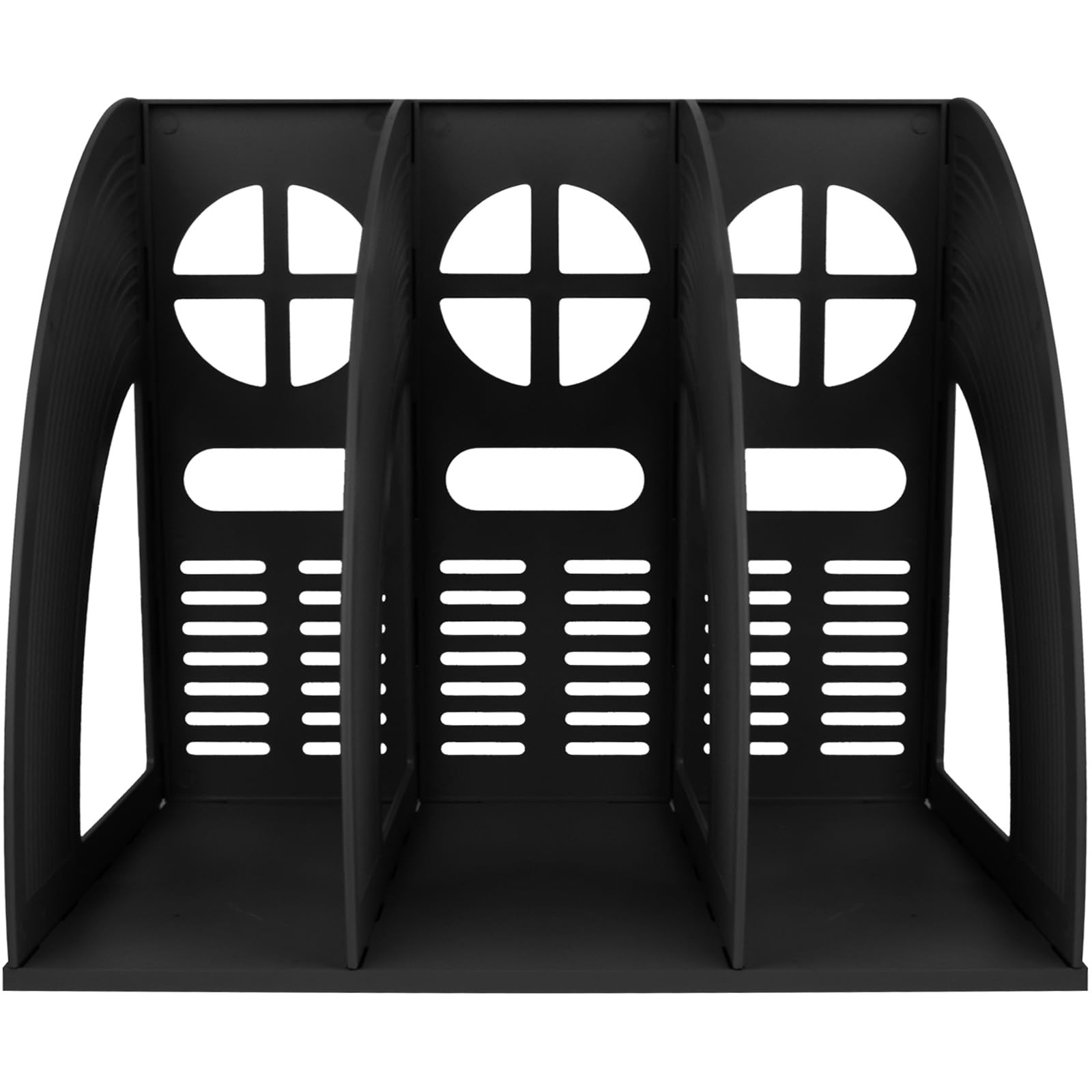 - HOLLOW OUT DESIGN: Hollow out design allows for easy ventilation and moisture control. Circular arc hollow on both sides can be used as handles for easy mobility. The file organizer is baffle-free for easy access to documents, and can hold larger sized files.