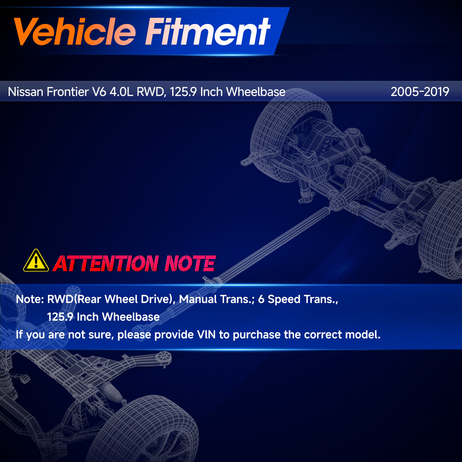 | Nissan | Frontier | 2005-2019 | V6 4.0L | Rear Side | RWD, 125.9 Inch Wheelbase |