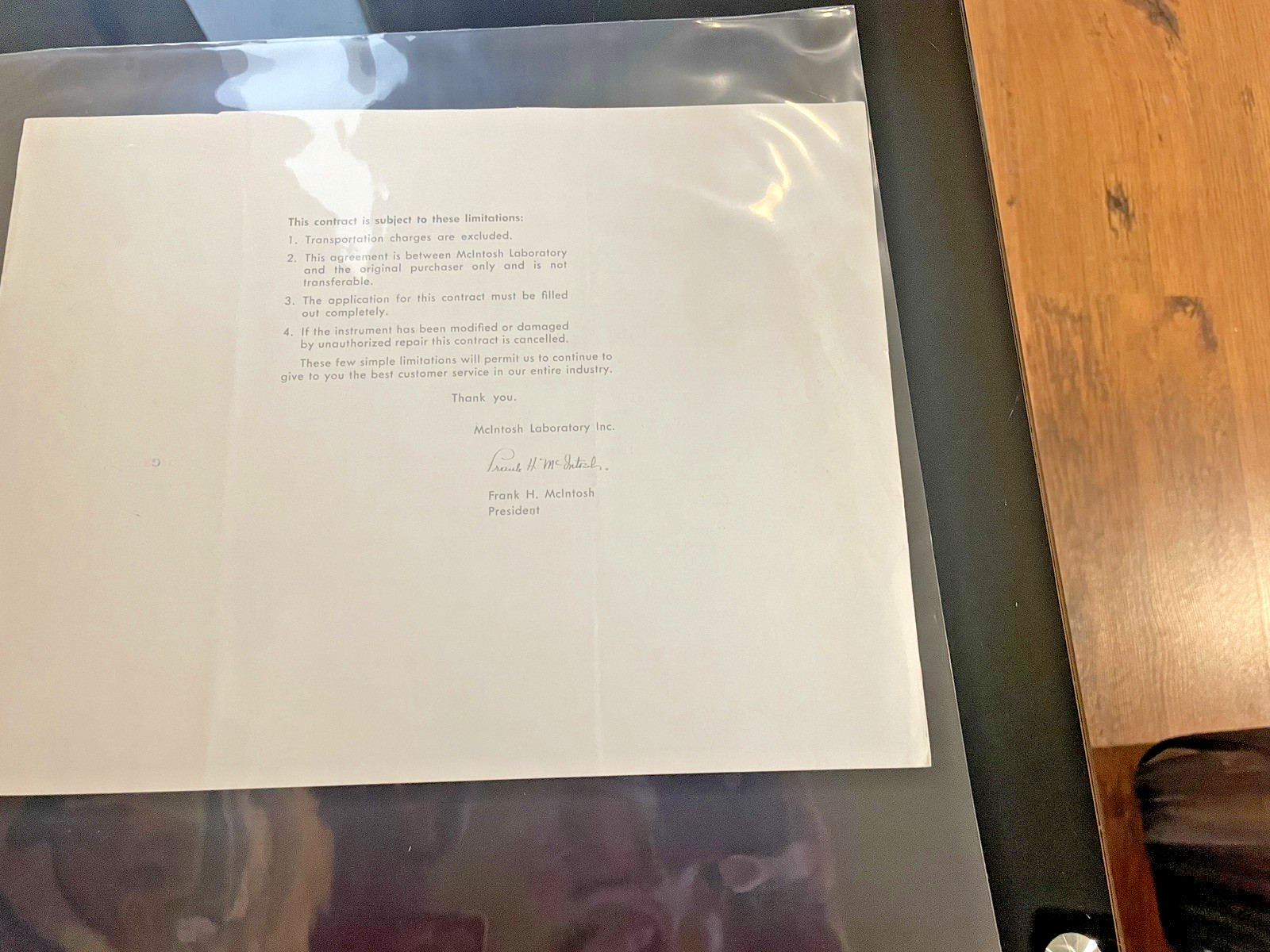 The product is a vintage McIntosh 3 year factory service contact, made in the United States. This item is a single unit and is in excellent condition. It is a valuable piece for collectors or individuals looking to maintain or repair vintage audio equipment from the renowned brand McIntosh.