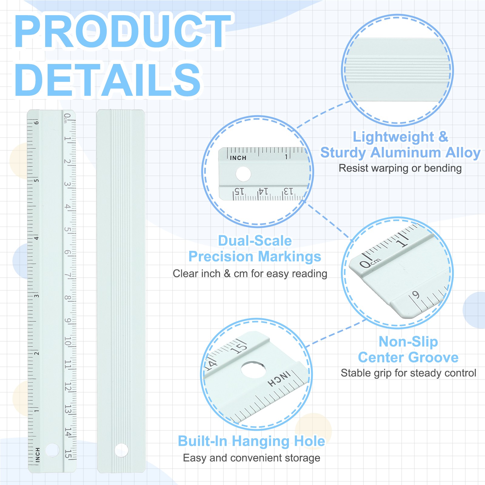 Crafted from aluminum alloy, this straight edge is lightweight, sturdy, and resistant to warping or bending. It features a dual-scale design with clearly etched inch and centimeter measurements for precise and easy reading and marking. The practical center groove maintains the ruler's straightness and flatness with a stable, non-slip grip for steady handling, making it easy to tear paper neatly along the edge.