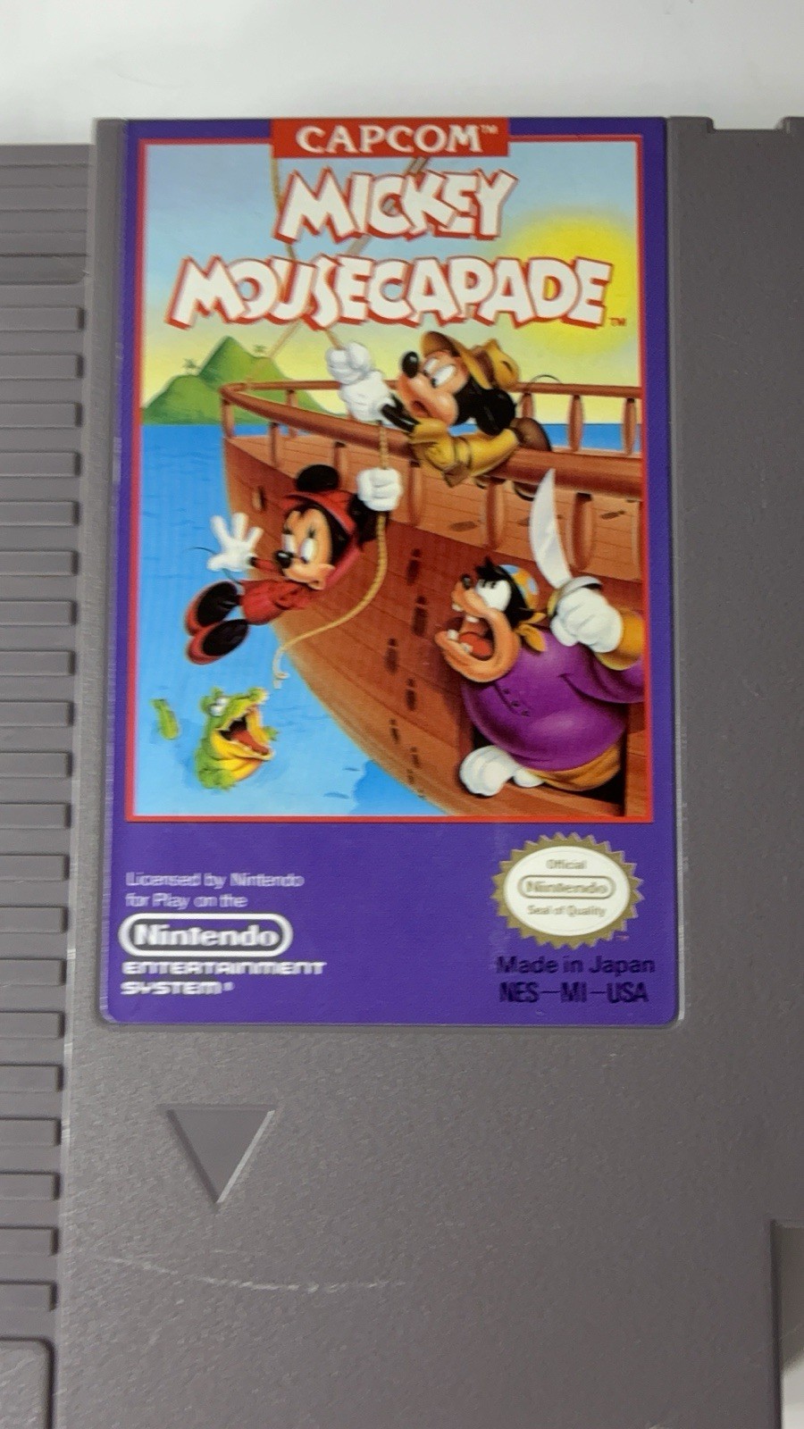 Mickey Mousecapade tested and recently played. Cartridge in good condition and contacts cleaned. Bottom of cartridge has wear from use. Front label has fine difficult to see marks from use. Top of cartridge label in good shape. Back of cartridge has sticker with numbers over bottom of cartridge. Rear label intact with quality control imprint of "21". Rear label does have fine scratches. Game tested but not played to completion.