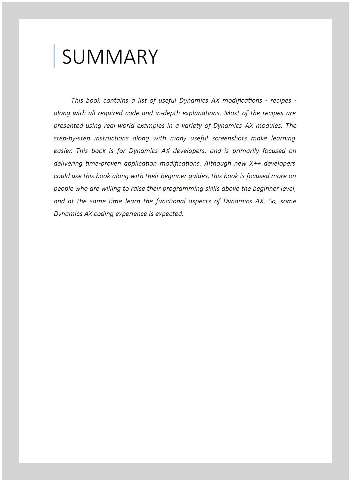 This book contains a list of useful Dynamics AX modifications - recipes - along with all required code and in-depth explanations. Most of the recipes are presented using real-world examples in a variety of Dynamics AX modules. The step-by-step instructions along with many useful screenshots make learning easier. This book is for Dynamics AX developers, and is primarily focused on delivering time-proven application modifications. Although new X++ developers could use this book along with their beginner guides, this book is focused more on people who are willing to raise their programming skills above the beginner level, and at the same time learn the functional aspects of Dynamics AX. So, some Dynamics AX coding experience is expected.