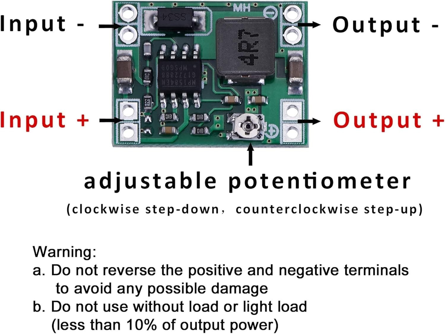 Mini MP1584EN DC to DC buck converter module with a wide operating range Input voltage: V to 28 V; Output voltage: V to 20 V Output current: 3 A (maximum); Conversion efficiency: 92% (maximum) Output ripple: less than 30 mV; Switching frequency: MHz (highest), typically 1 MHz Operating temperature: -45 ℃ to 85 ℃; Size: 22 mm by 17 mm by 4 mm; Warning: do not reverse the positive and negative terminals to avoid any possible damage; Do not use light load (less than 10% of output power) or without load