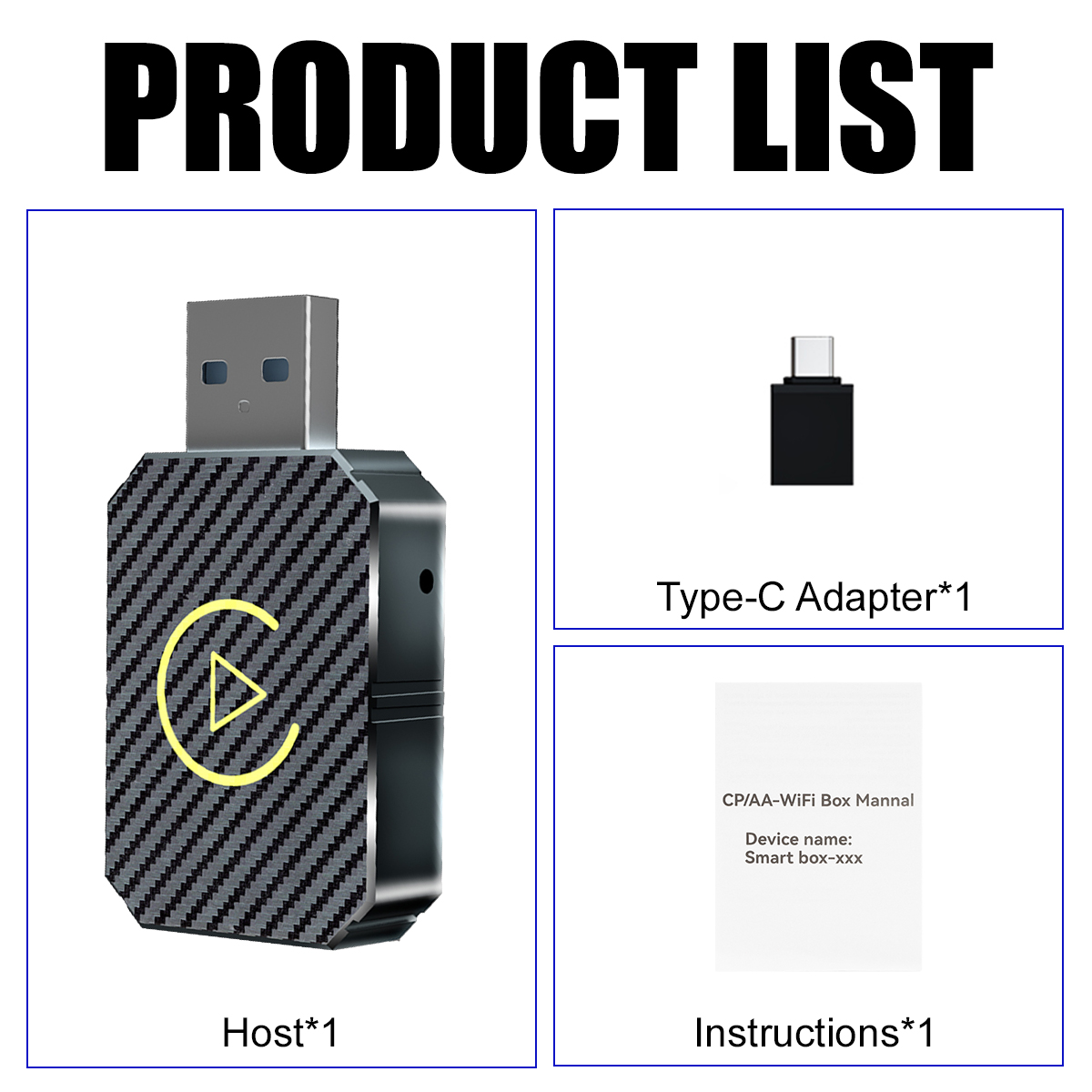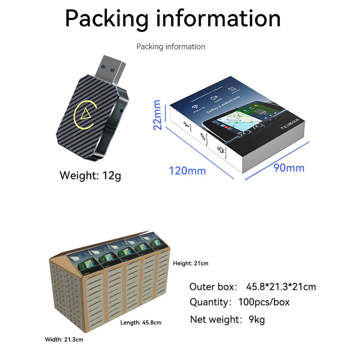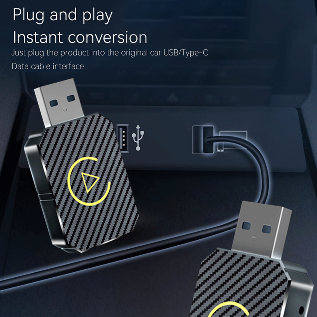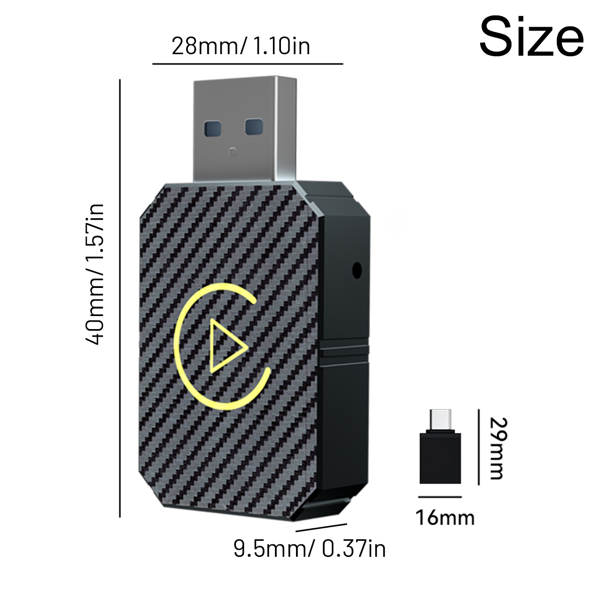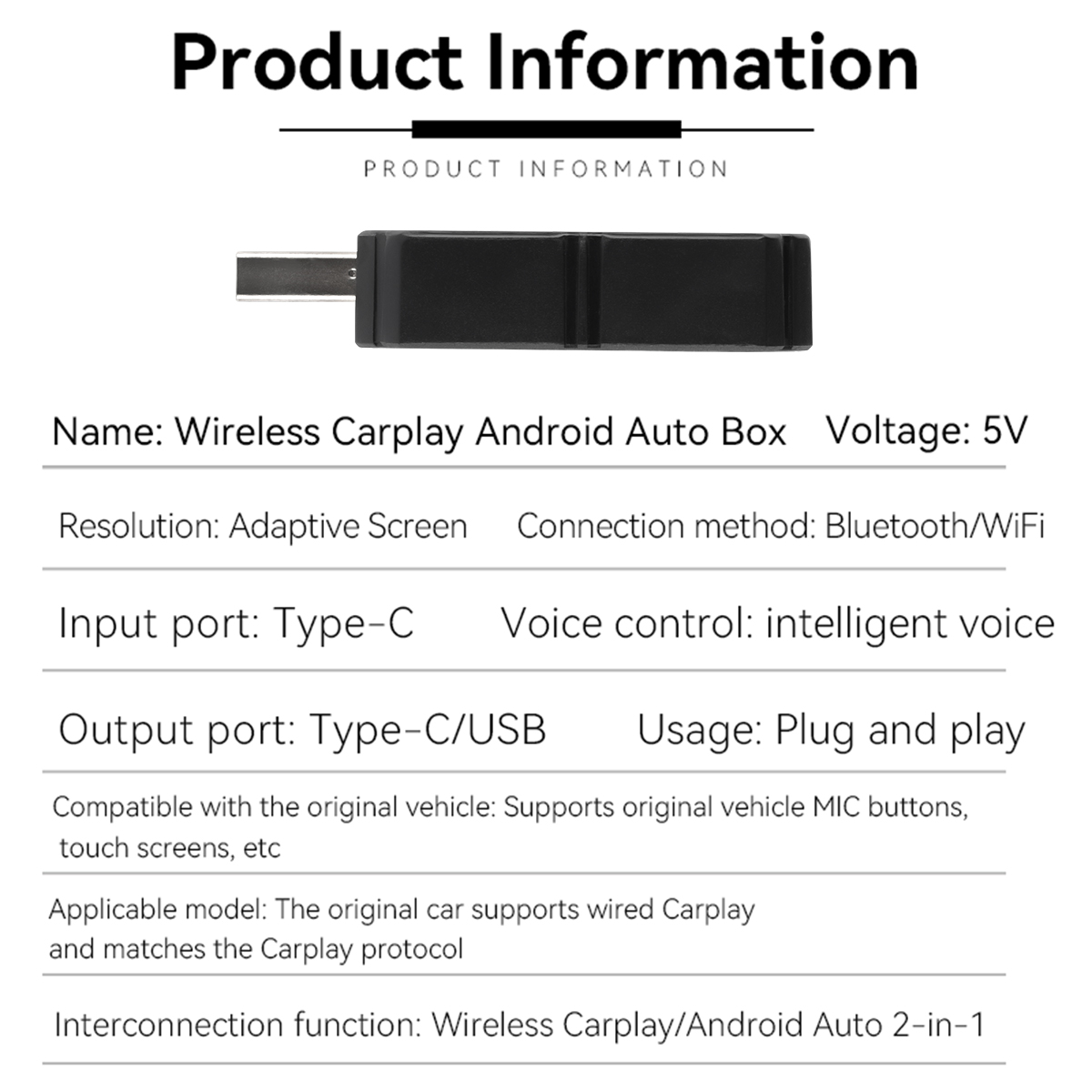 Specification: Material: ABS Color: Carbon fiber pattern black Resolution: adaptive screen Input port: Type-C Output port: Type-C/USB Voltage: 5V Connection method: Bluetooth-Compatible/Wifi Bluetooth-Compatible compatible: Bluetooth-Compatible 5.0 Voice control: smart voice How to use: plug and play Compatible with the original car: support the original car MIC button touch screen, etc. Interconnection function: Wireless Carplay/Andriod Auto combo Size: 40*28*9.5 mm Applicable models of mobile phones: Android Auto-compatible mobile phones: Only Android models are supported (for Andriod version 11 and above) Carplay---Compatible mobile phones: Compatible with iPhone 6 and above, (for i OS 10 and above mobile phones Compatible cars: all original or modified cars with wired CarPlay/Andriod AUTO function