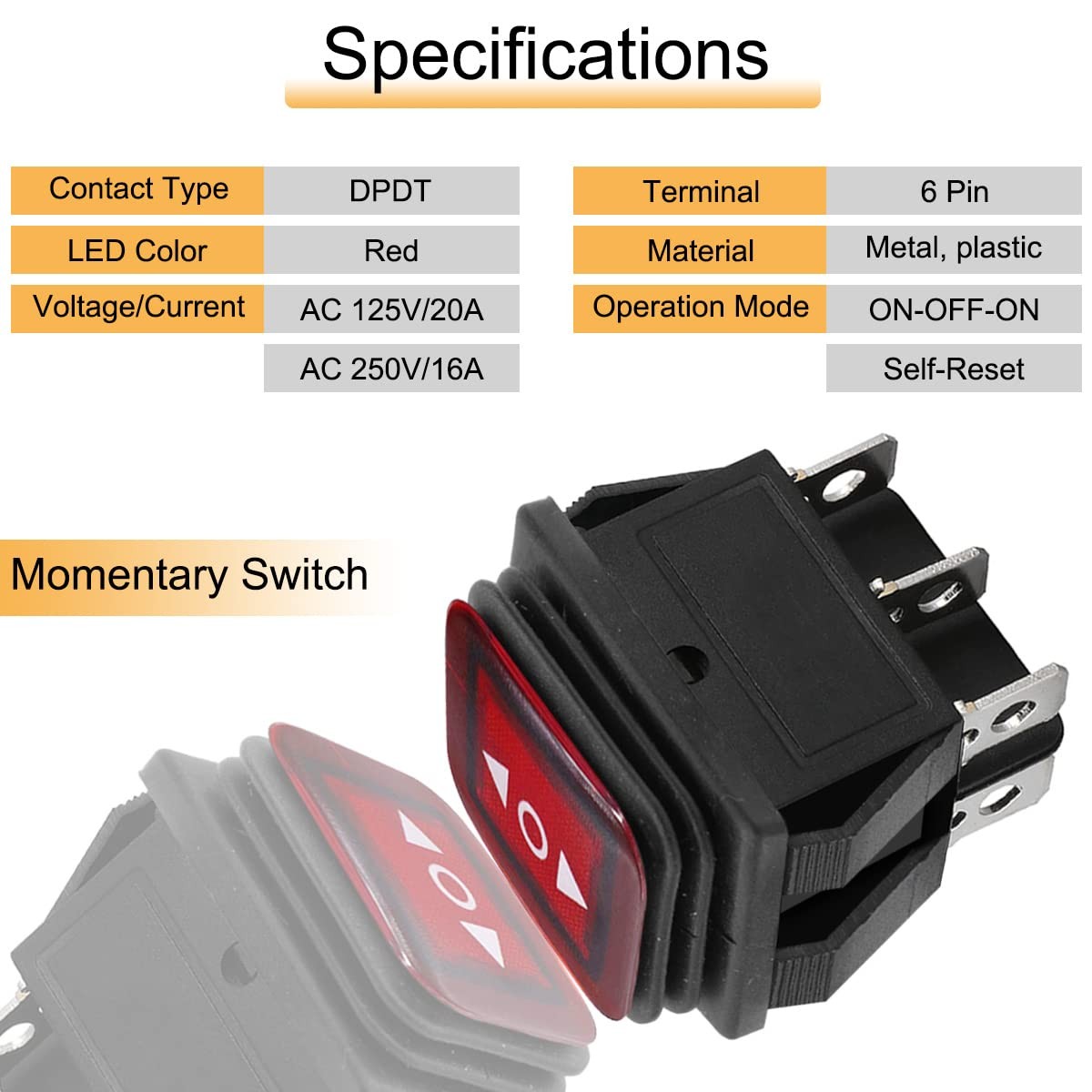 Feature: Rocker switch is momentary meaning it springs back to the center off position when the toggle is released. The switch will reset automatic back to off if released. With red LED, only lights up at AC 220V.