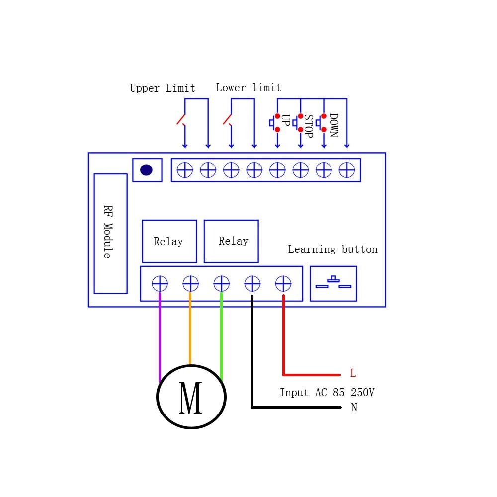 Learning Code : Press the learning button for 1 time,the learning indicator flashes slowly,Then press the transmitter button up (first button default for forward) ,the learning indicator flash 5 times and OFF,It mean the first button learning Successfully Press the learning button for 2 times,the learning indicator flashes slowly,Then press the transmitter button down (second button default for forward) ,the learning indicator flash 5 times and OFF,It mean the second button learning Successfully(Third button default for stop ,When the jumper set for Latched)